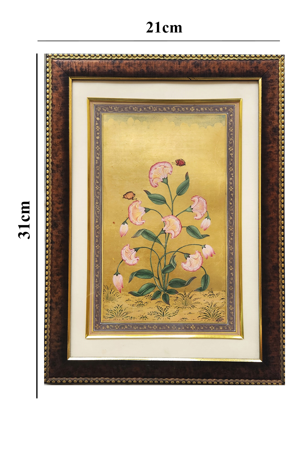 This exquisite Mughal miniature painting, titled "Blossoms of Serenity," showcases the elegance and intricacy of traditional Mughal art. The painting features:
