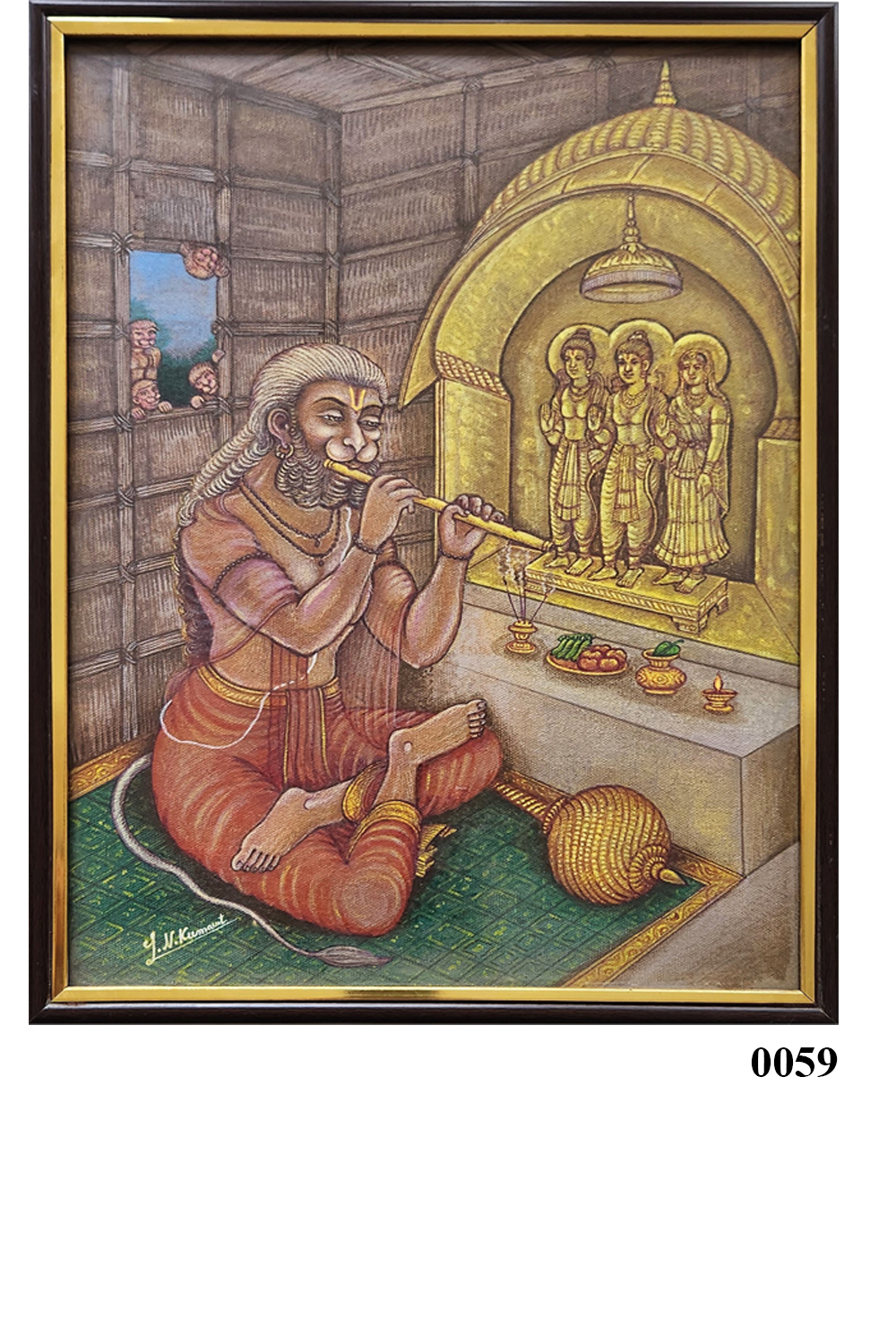 This intricate miniature painting captures the profound devotion of Lord Hanuman as he worships the revered trio of Ram, Sita, and Laxman. Key features include: