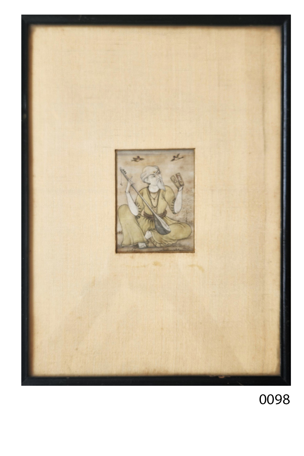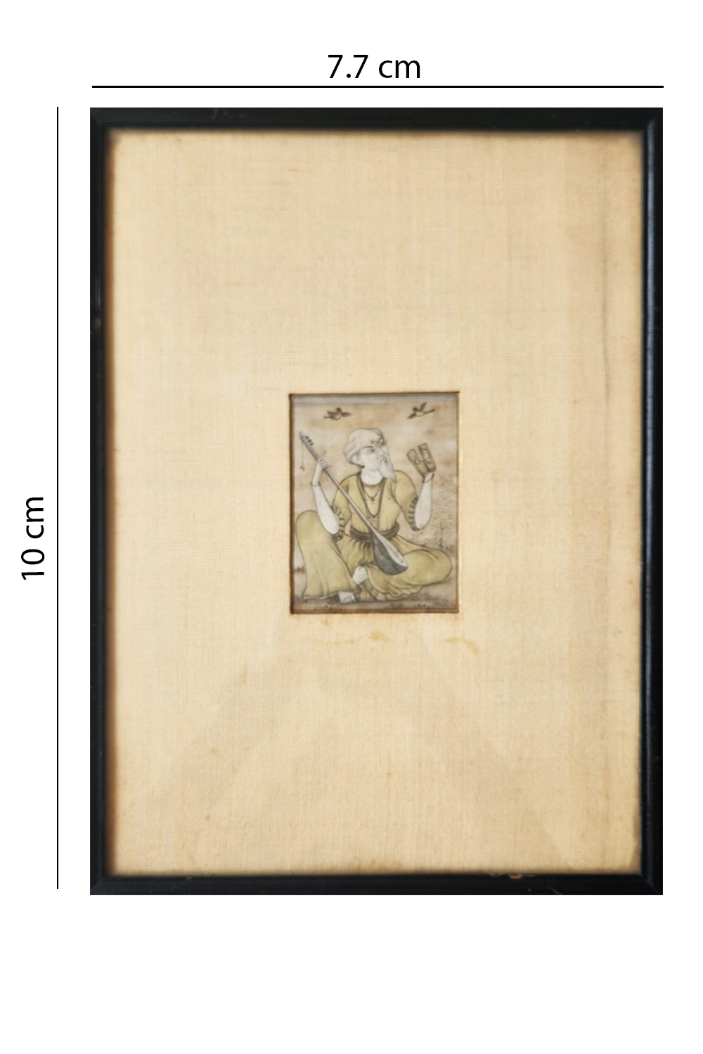 This miniature painting portrays a serene scene of a sage engaged in musical and scholarly pursuits. The sage is seated cross-legged, holding a veena in one hand and a book in the other. The background features two birds in flight, adding a sense of tranquility and connection with nature. The sage is adorned in traditional attire, with a calm and focused expression. The painting is framed in a simple black frame, which contrasts with the delicate and detailed artwork. The use of muted colors and fine brushwork highlights the intricate details and the peaceful ambiance of the scene.