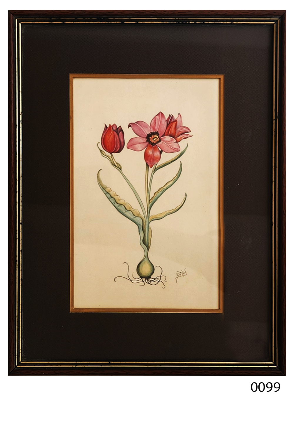 This exquisite miniature painting features a detailed botanical illustration of tulips. The painting includes: