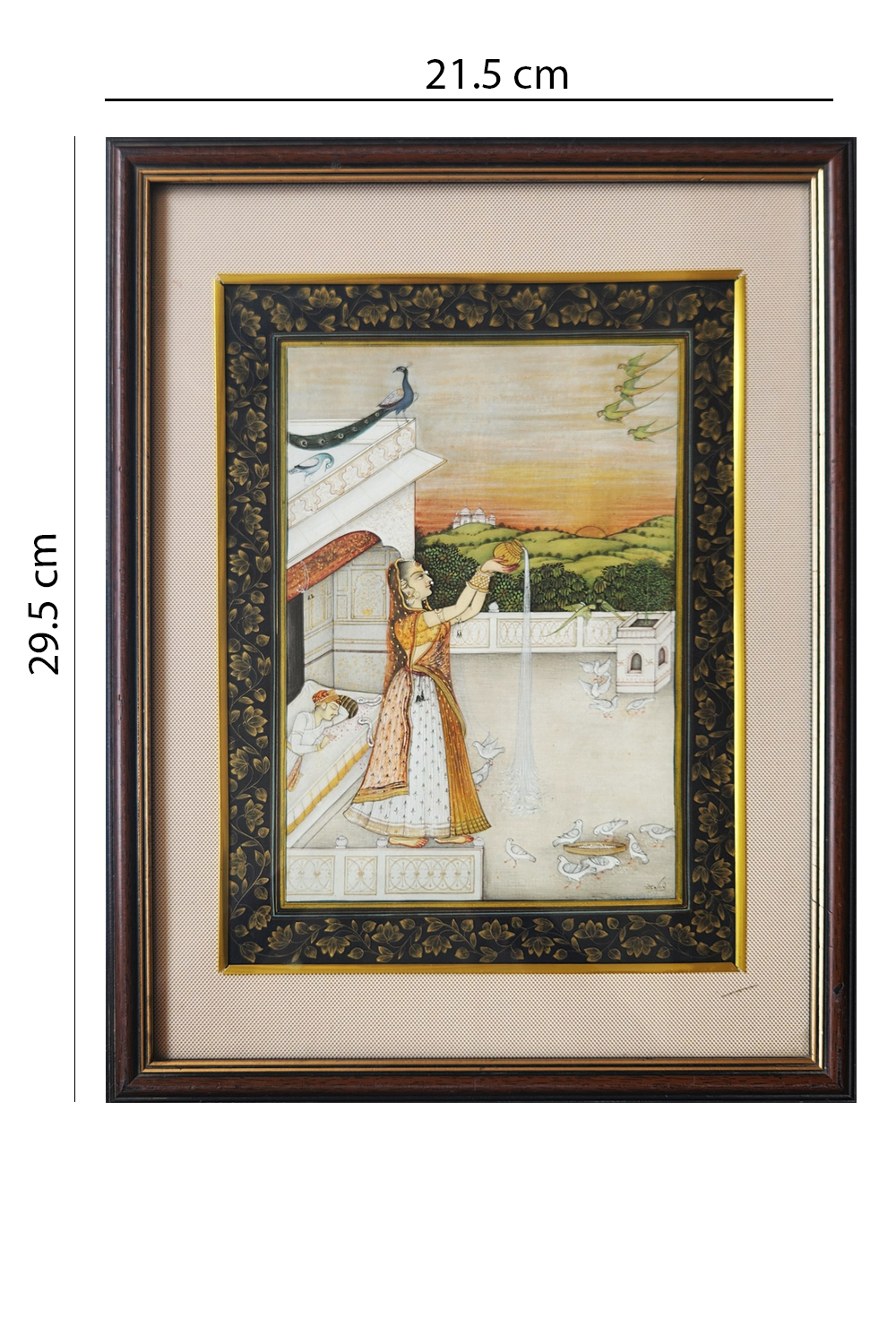 This exquisite miniature painting captures a tranquil morning scene on a terrace, featuring: