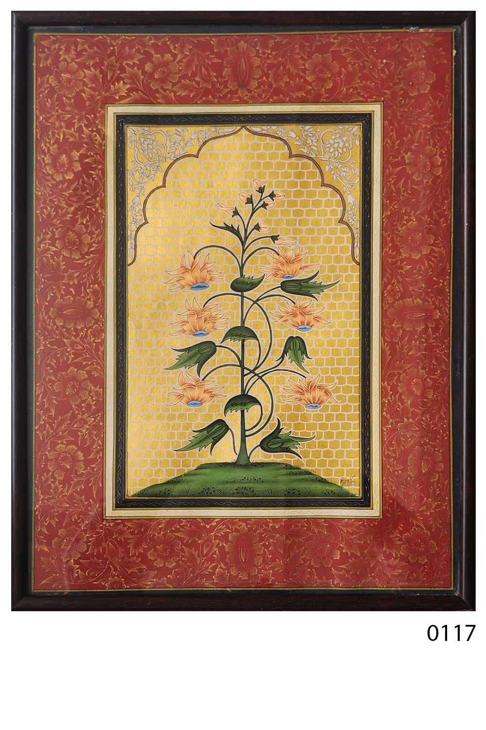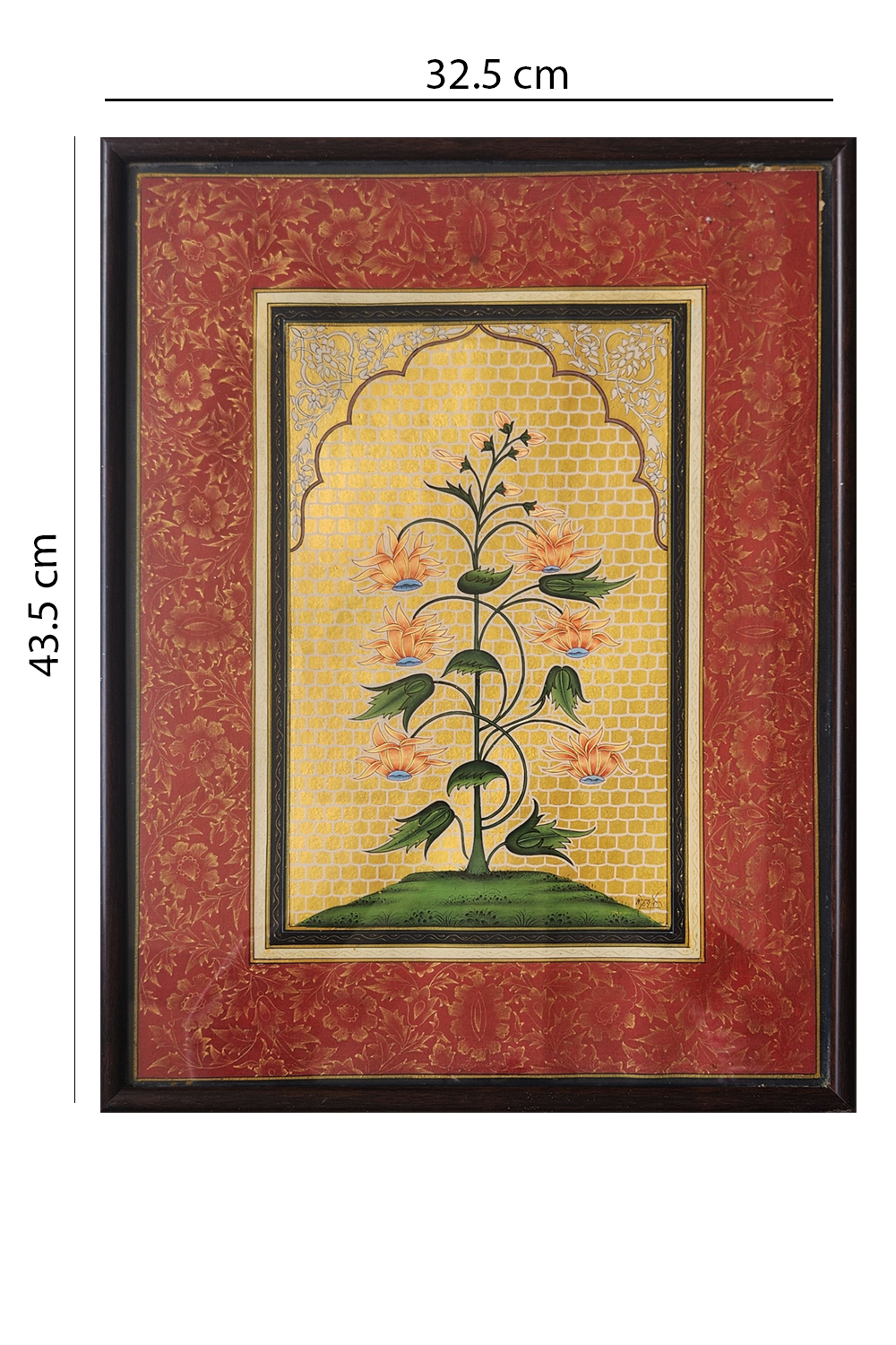 This exquisite miniature painting showcases a stylized flowering plant set against a golden yellow background with a lattice pattern. The painting is framed by an ornate arch design and surrounded by a rich red border with floral motifs. Key features include: