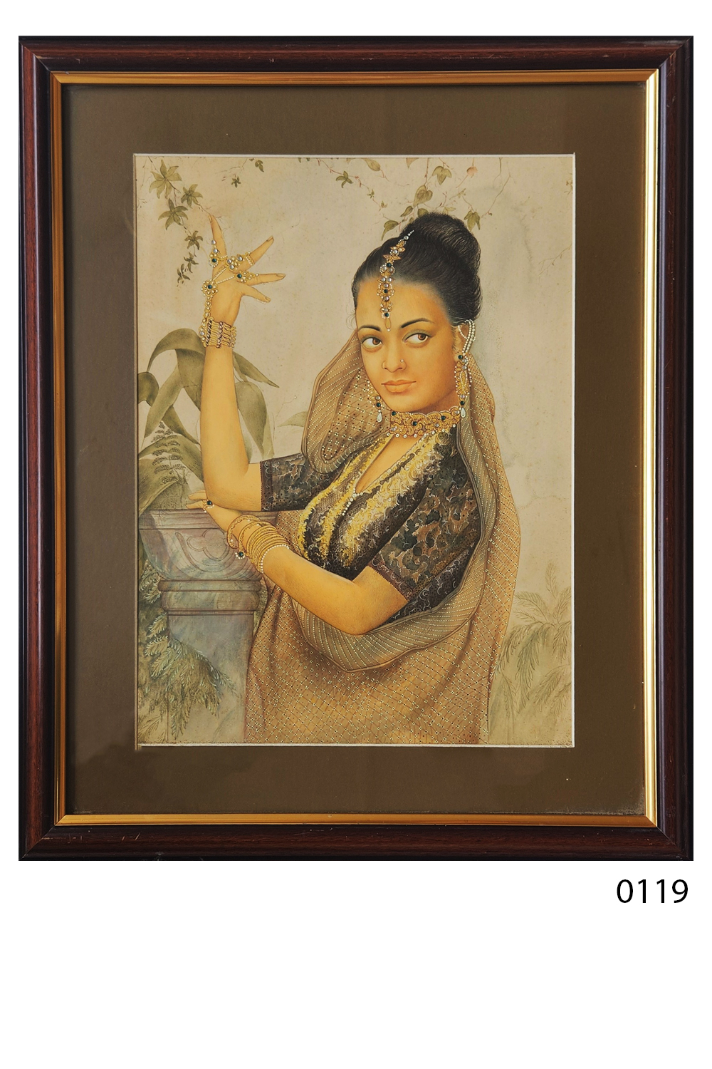 This painting depicts a traditional Indian woman in a graceful and elegant pose, showcasing the rich cultural heritage of India. The woman is adorned with intricate jewelry, including bangles, rings, and a headpiece, which highlights the detailed craftsmanship. She is dressed in a beautifully embroidered saree with a matching blouse, adding to the overall elegance of the artwork. The background features subtle botanical elements, enhancing the serene and natural ambiance of the painting. The use of soft colors and delicate brushstrokes further accentuates the grace and poise of the subject.