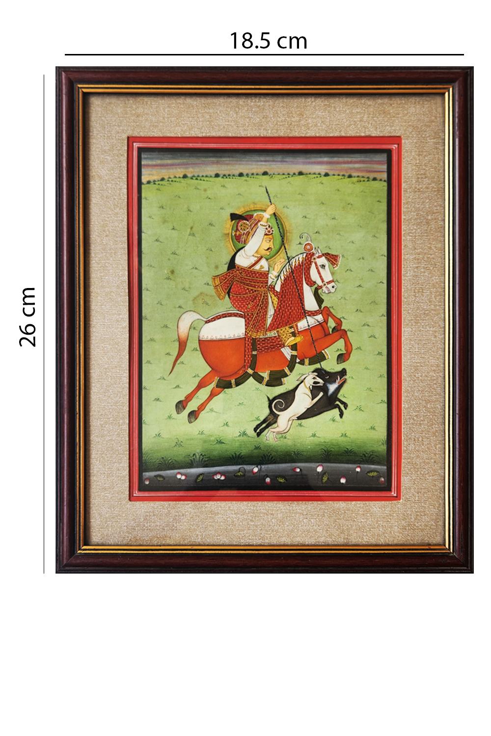 The image shows a beautifully framed miniature painting of a royal figure on horseback, engaged in a hunting scene. The hunter, dressed in traditional regal attire, is about to strike a wild boar with a spear. The painting is detailed and vibrant, capturing the essence of a royal hunt with elegance and precision. This artwork is interesting for its historical and cultural significance, as well as its intricate craftsmanship. This exquisite miniature painting depicts a royal hunter on a majestic horse, poised to strike a wild boar with a spear. The painting is rich in detail and vibrant colors, showcasing the following features: