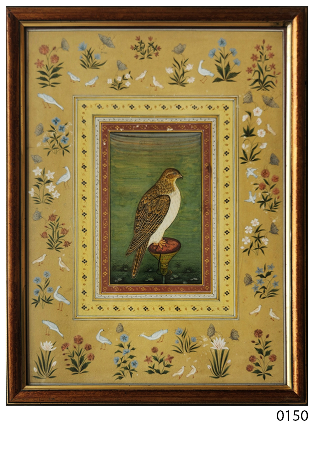 This exquisite miniature painting showcases a falcon perched gracefully on a stand, set against a green backdrop. The painting is framed by multiple borders, each adorned with intricate patterns. Surrounding the central image are beautifully detailed floral and avian motifs, featuring various birds and flowers in vibrant colors. The artwork is enclosed in a wooden frame, enhancing its elegance. Key features include:
