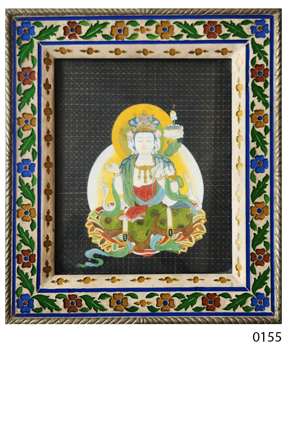 This exquisite miniature painting, titled "Divine Serenity," showcases a deity seated in a meditative pose, surrounded by a radiant halo. The deity is adorned with elaborate jewelry and holds symbolic objects in multiple hands. The painting is framed with a beautifully detailed border featuring colorful floral motifs. The frame itself is a work of art, enhancing the overall aesthetic appeal of the piece. The intricate details and vibrant colors make this painting a captivating representation of divine tranquility.