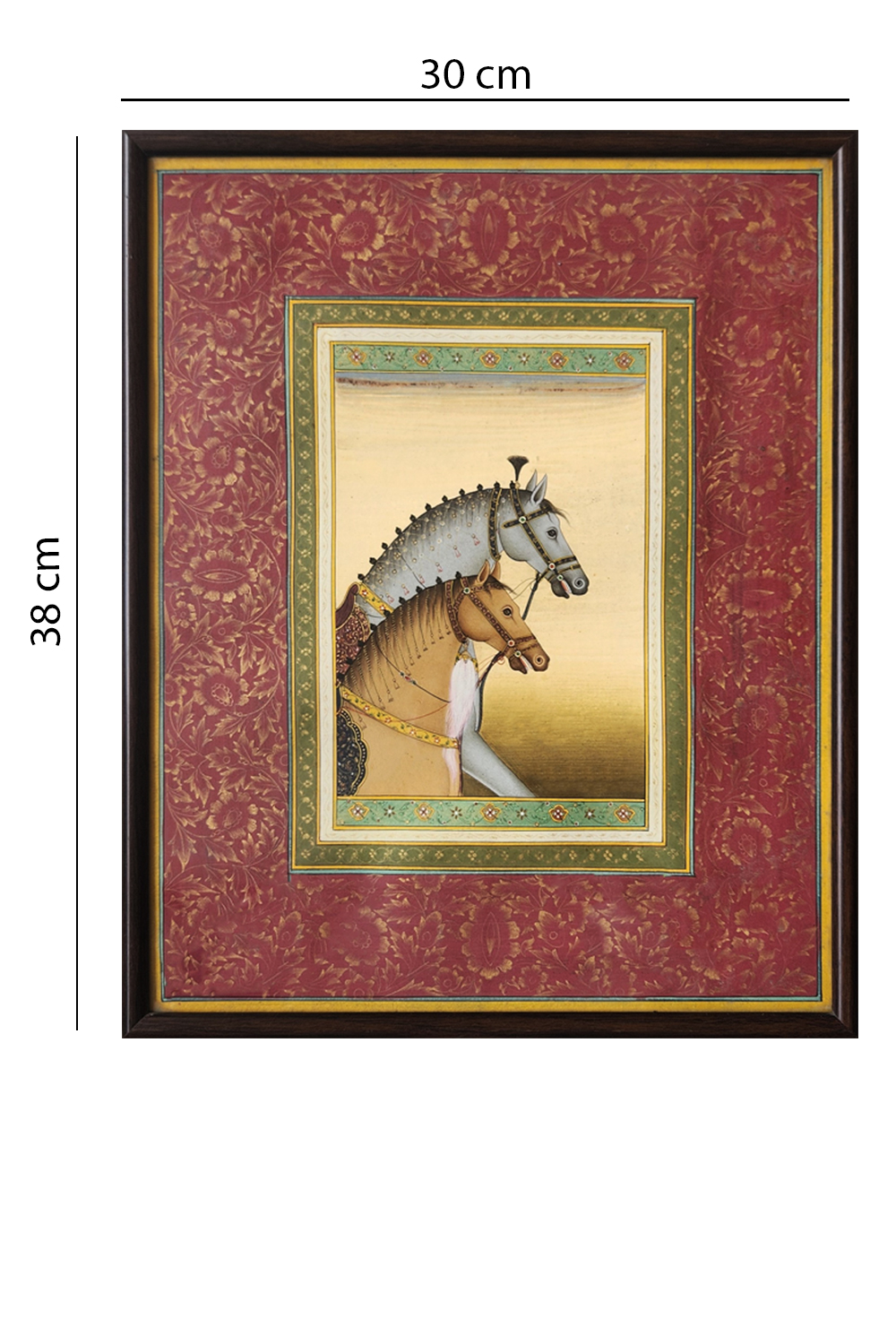 This exquisite miniature painting showcases two horses, one white and one brown, adorned with intricate bridles and saddles, reflecting the grandeur of Mughal art. The painting is framed with a rich, floral-patterned border in shades of red and green, enhancing its regal appearance. The horses are depicted with meticulous attention to detail, highlighting their majestic posture and the ornate decorations. The background features a golden hue, adding a touch of opulence to the overall composition. The painting is a fine example of traditional craftsmanship, capturing the elegance and nobility of the subjects.