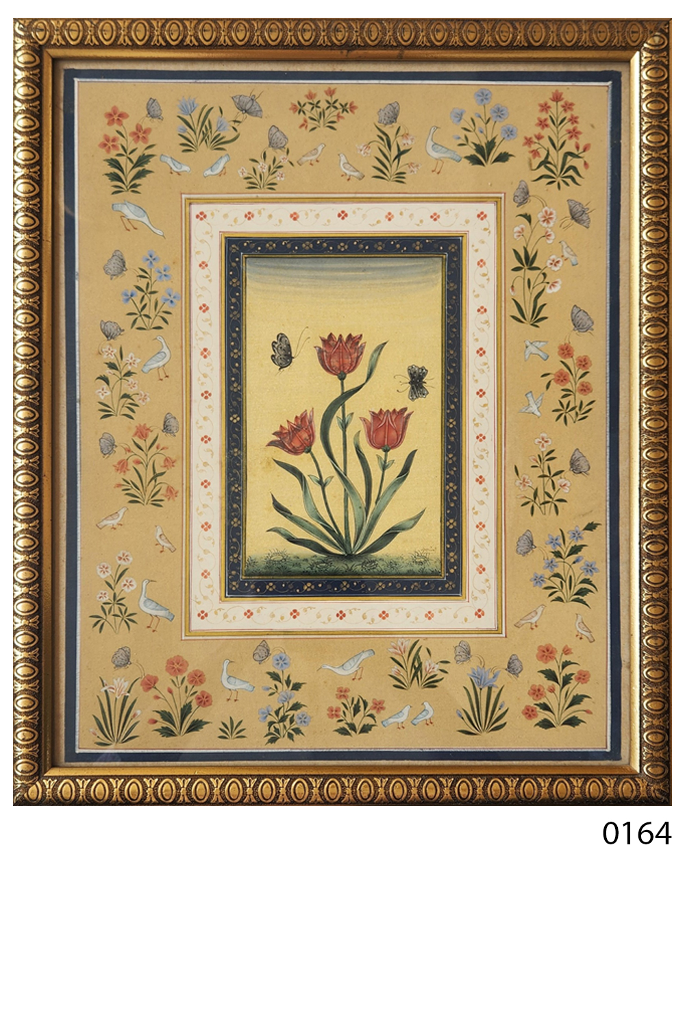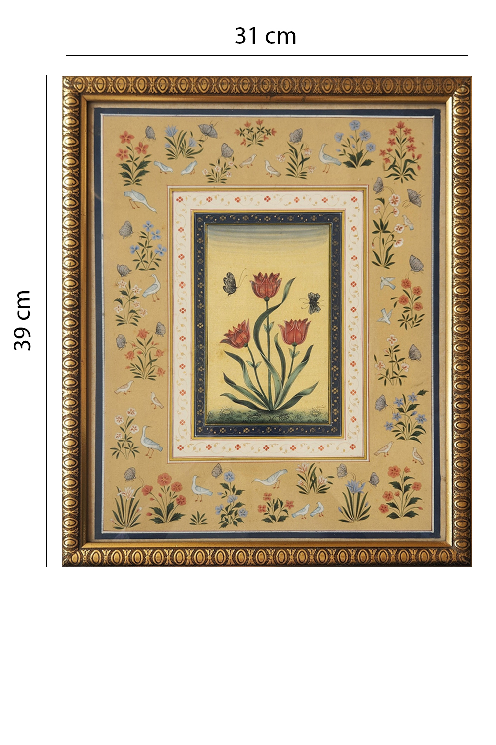 This exquisite miniature painting showcases a central composition of three blooming tulips, accompanied by two butterflies, set against a yellow background. The artwork is framed by a detailed border adorned with various flowers, birds, and butterflies, creating a harmonious and lively scene. The painting is characterized by: