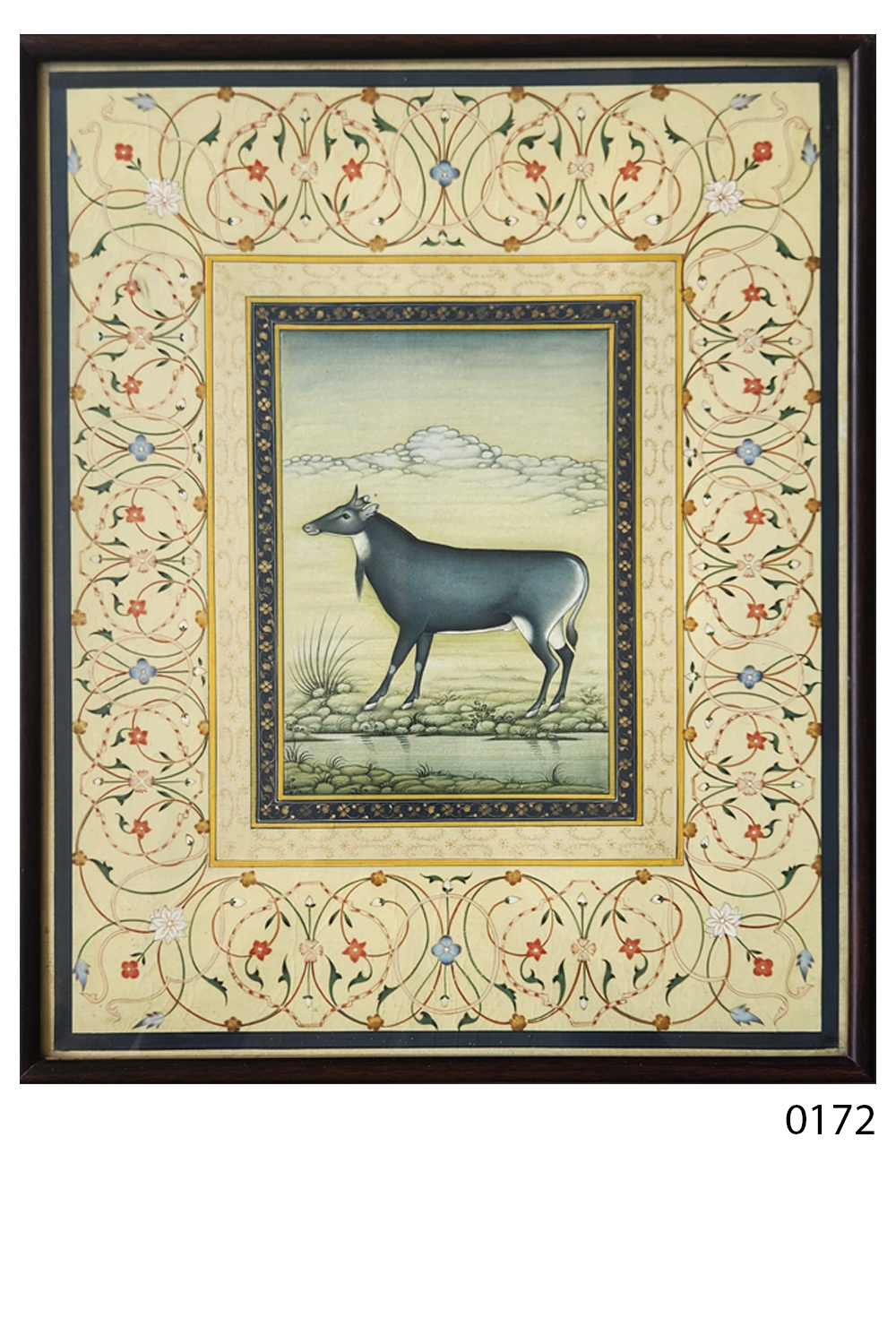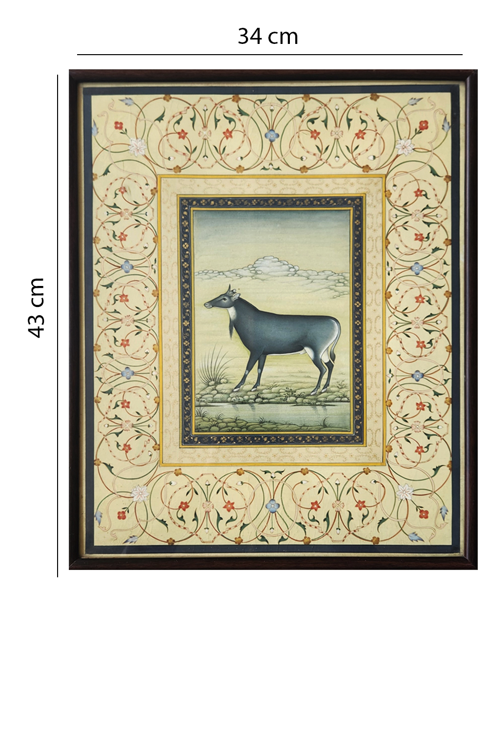 This exquisite miniature painting showcases the elegance of Mughal art with its detailed depiction of a Nilgai, an Indian antelope, standing gracefully in a tranquil landscape. The painting is framed by an ornate border featuring intricate floral and vine patterns, characteristic of Mughal artistry. The background is a serene scene with soft clouds and delicate vegetation, enhancing the peaceful ambiance. The Nilgai is rendered with meticulous attention to detail, highlighting its majestic posture and natural beauty. The use of muted colors and fine brushwork exemplifies the sophistication of traditional miniature painting techniques.