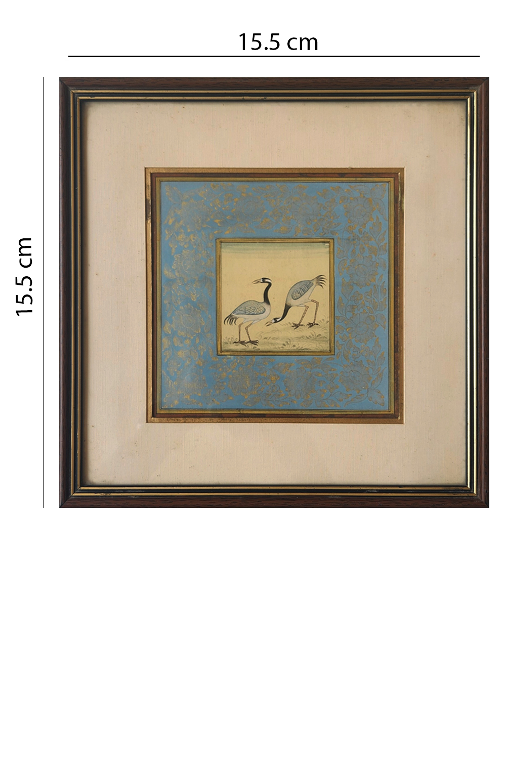 This exquisite miniature painting captures the elegance of two cranes, rendered with fine detail and precision. The artwork is set against a soft, neutral background, allowing the birds to stand out prominently. The painting is framed with a beautiful blue border adorned with gold floral motifs, adding a touch of opulence. The cranes are depicted in a dynamic pose, suggesting movement and grace. The use of subtle colors and intricate brushwork highlights the artist's skill and attention to detail.