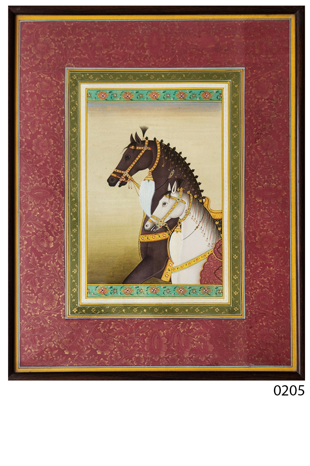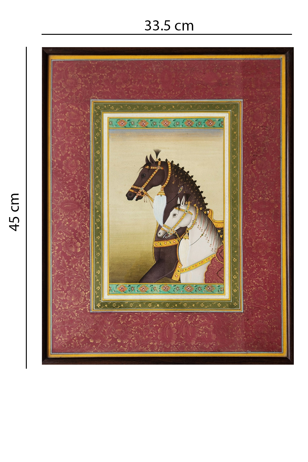 This exquisite miniature painting showcases two horses, one black and one white, adorned with intricate and colorful bridles and harnesses. The painting is framed with a rich maroon border featuring delicate floral patterns, adding to its regal appearance. The inner frame is decorated with a green and gold motif, enhancing the central image's elegance. The horses are depicted with meticulous attention to detail, highlighting their majestic presence and the opulence of their adornments. The background is kept minimal, ensuring the focus remains on the beautifully rendered horses.