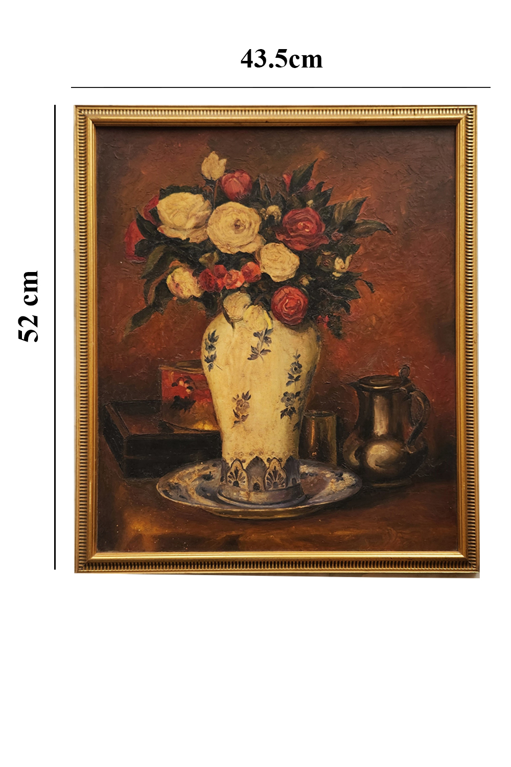 This oil painting captures the timeless beauty of a still life arrangement with meticulous detail and rich colors.