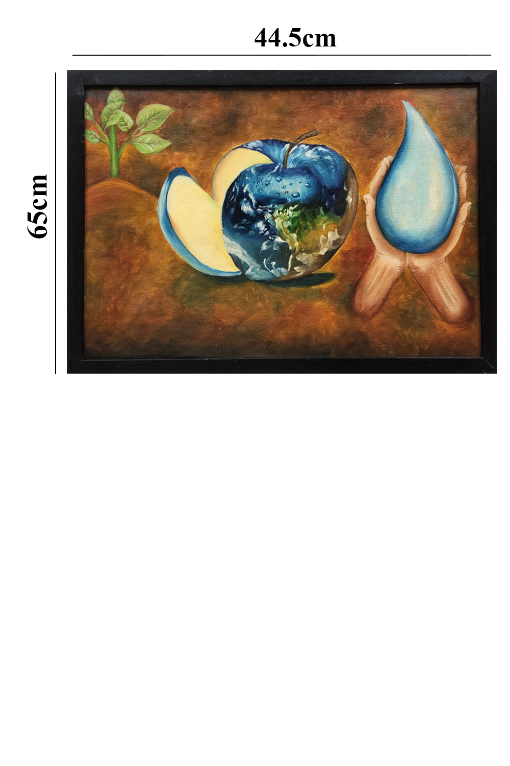 This oil painting, titled "Essence of Earth," captures the delicate balance of nature through symbolic imagery. The central focus is a blue apple, with the Earth's continents and oceans painted on its surface, representing the planet's natural bounty. Slices of the apple lie beside it, emphasizing the idea of sharing and sustainability. To the right, a pair of hands gently cradles a large water droplet, symbolizing the preciousness of water. In the background, a small plant with green leaves signifies growth and renewal. The painting's earthy tones and surreal elements create a thought-provoking piece that highlights the importance of environmental conservation.