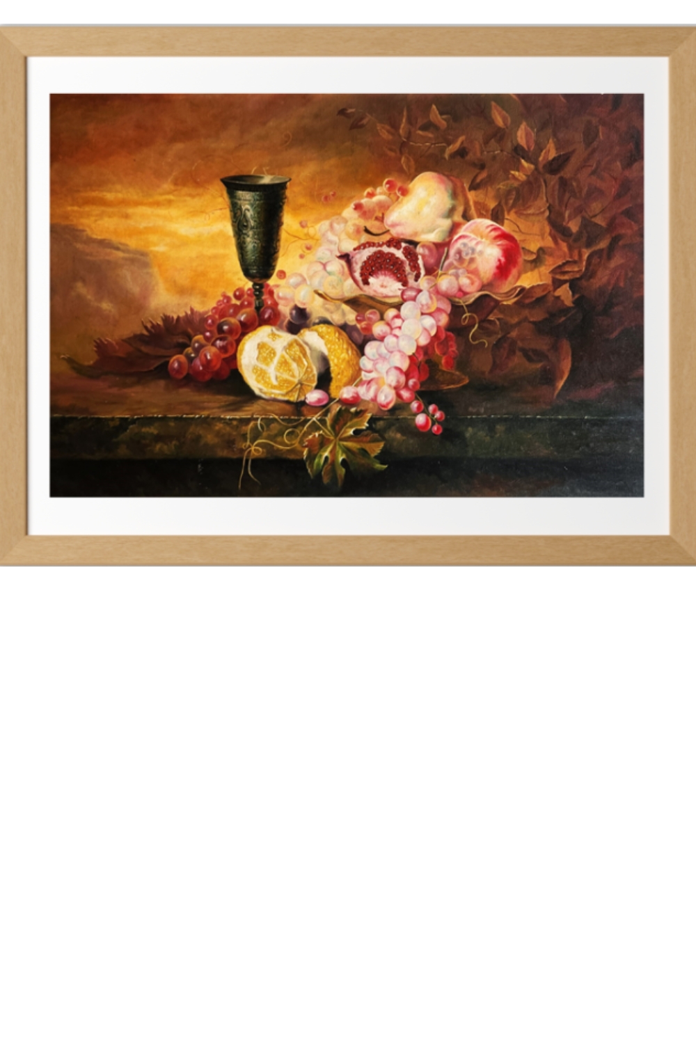 A decorative, ornate goblet standing prominently among the fruits.
