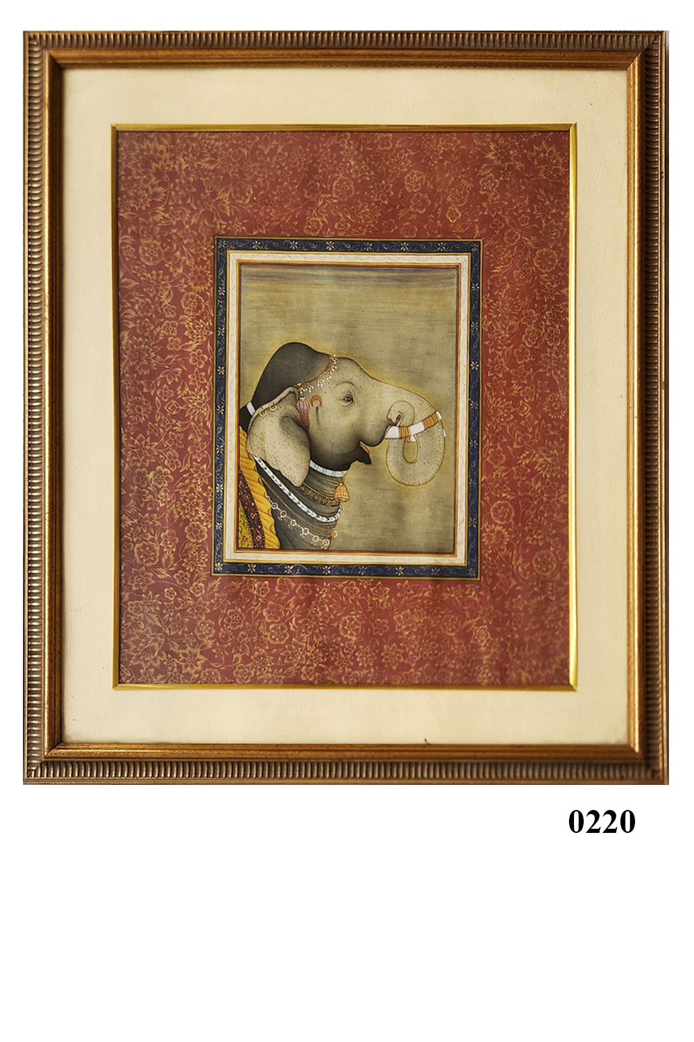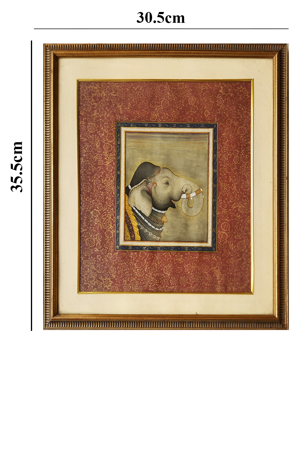 This exquisite miniature painting showcases a side profile of an elephant, adorned with intricate jewelry and a regal headdress. The painting is set against a muted background, emphasizing the detailed ornamentation and the elephant's dignified expression. The artwork is framed with a decorative border and mounted on a rich, patterned red background, enhancing its traditional aesthetic. Key features include: