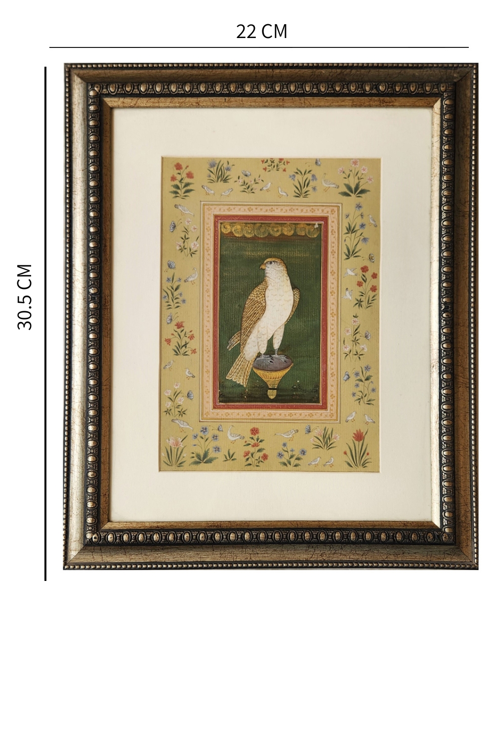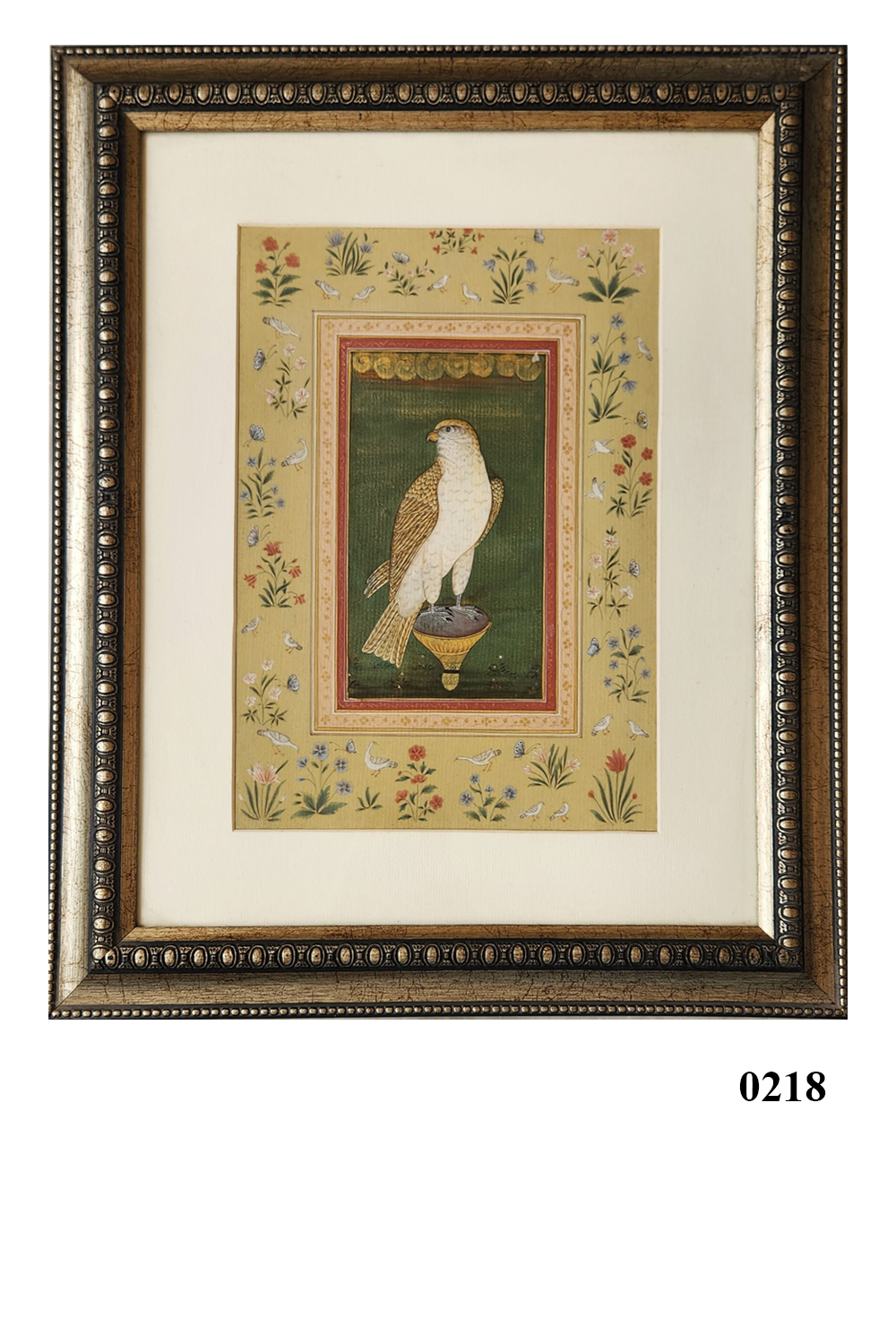 This miniature painting, titled "Royal Tranquility," portrays a regal figure dressed in elaborate traditional attire, seated in a meditative pose in a serene garden. The painting features: