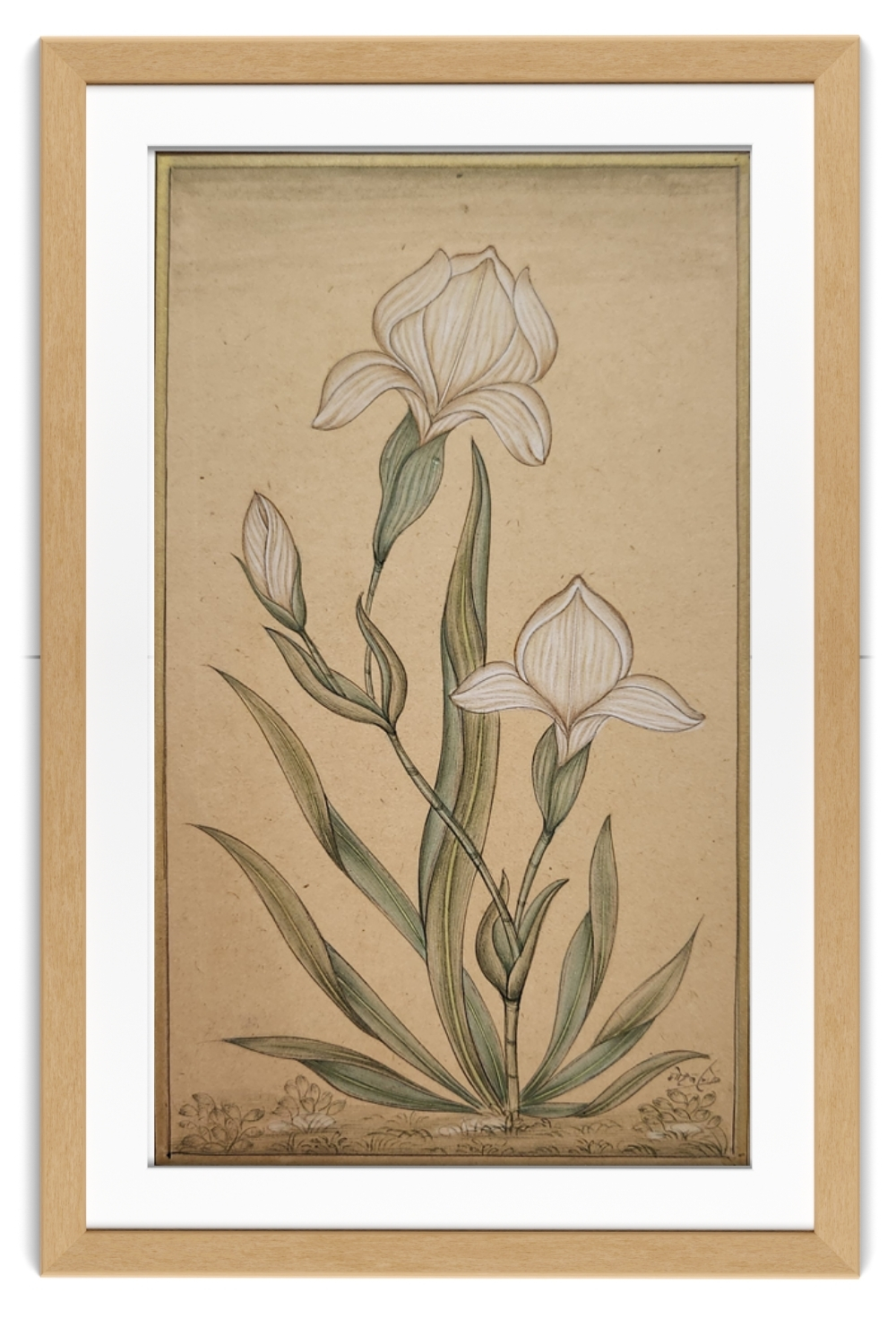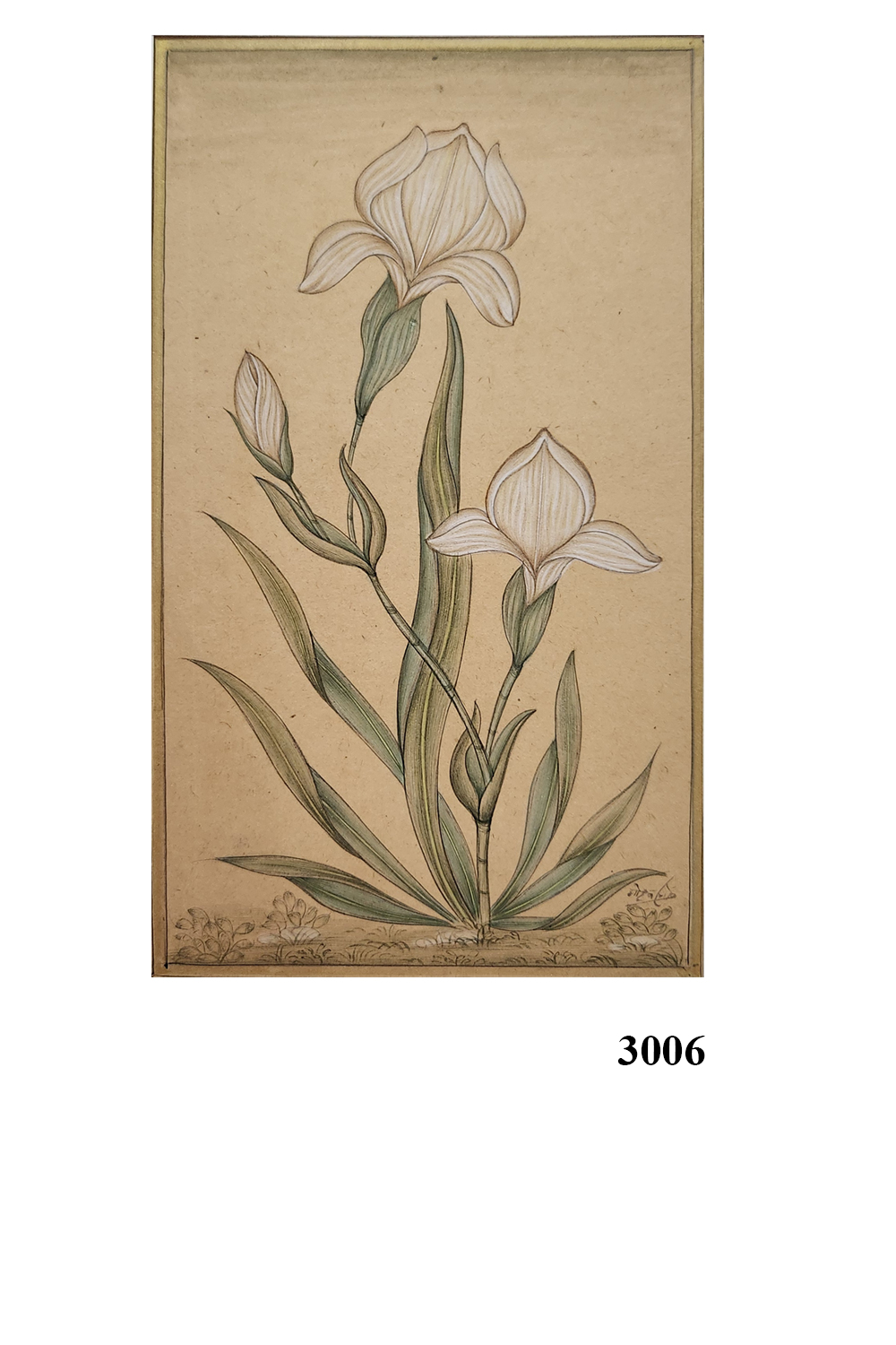 Brief Description of the Image: The image shows a framed miniature painting of two iris flowers, one fully bloomed and the other partially opened, with detailed and delicate line work. The painting is set against a subtle beige background, highlighting the elegance and grace of the flowers. The leaves are elongated and slender, adding to the overall delicate appearance of the artwork. This painting is interesting for its intricate detailing and the traditional miniature painting techniques used to create it.