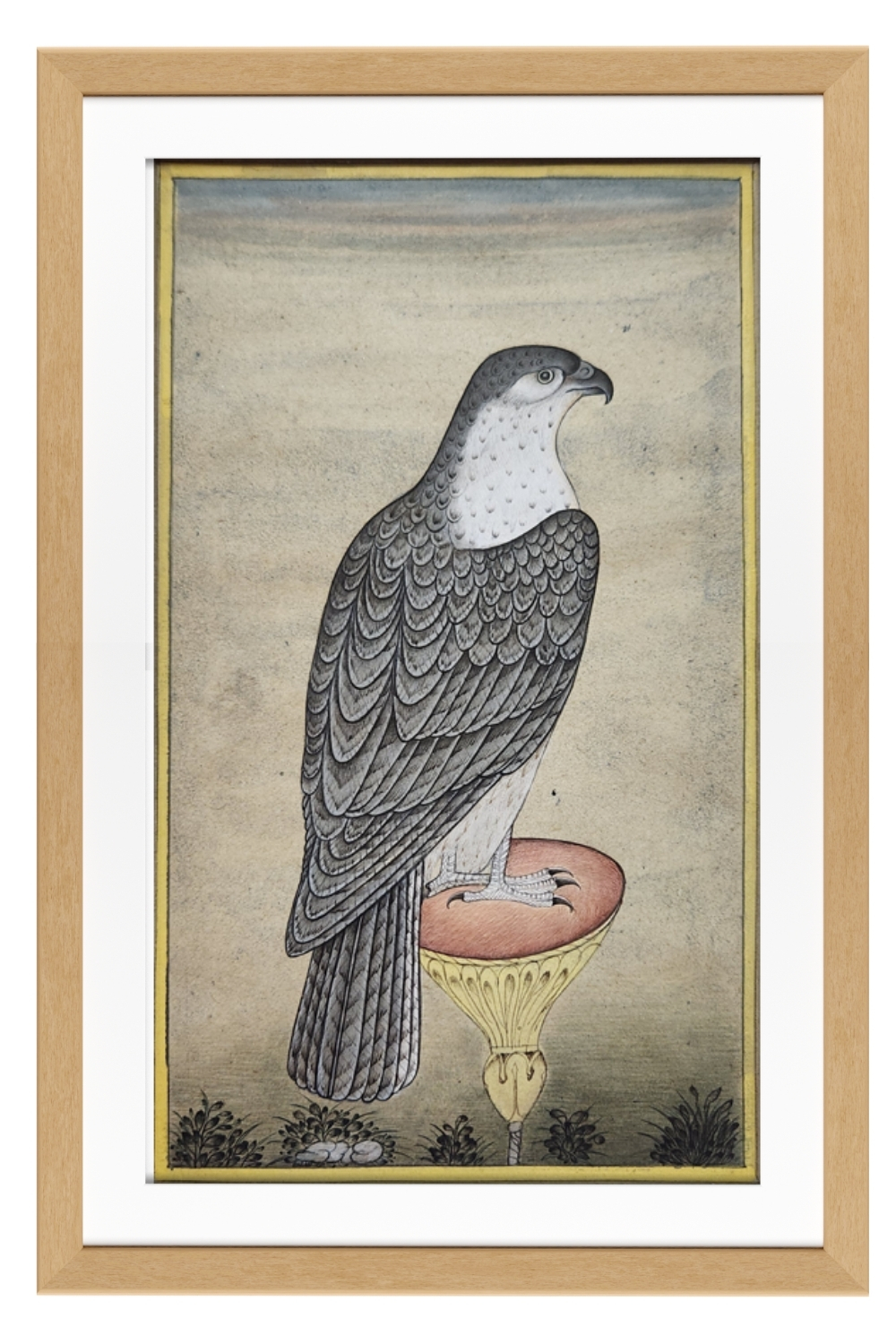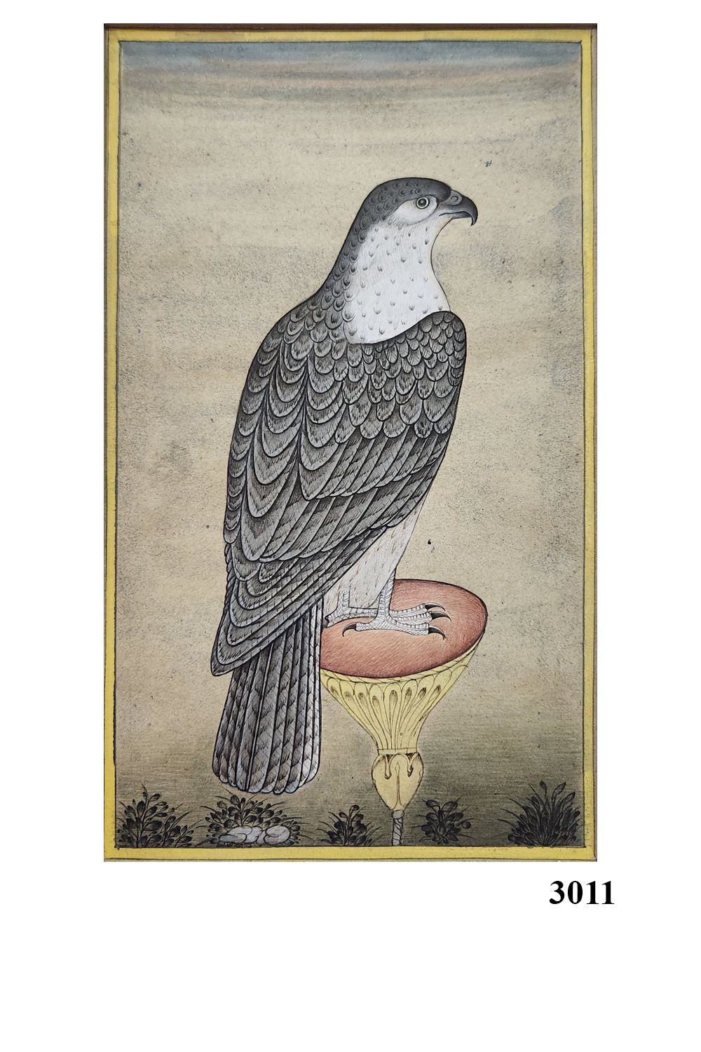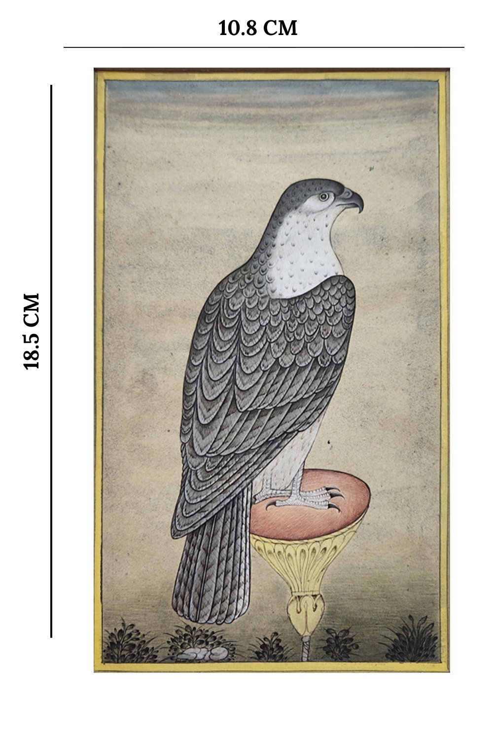 This exquisite miniature painting captures the elegance and majesty of a falcon perched on a decorative stand. The artwork is characterized by: