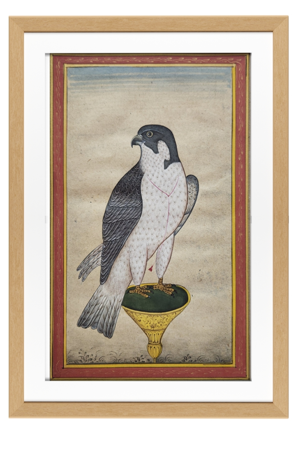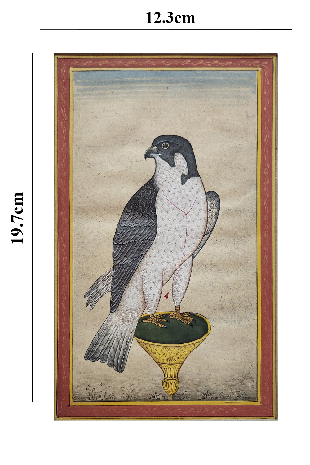 This exquisite miniature painting depicts a falcon perched majestically on a decorative stand. The artwork is characterized by its meticulous attention to detail and vibrant colors. Key features include: