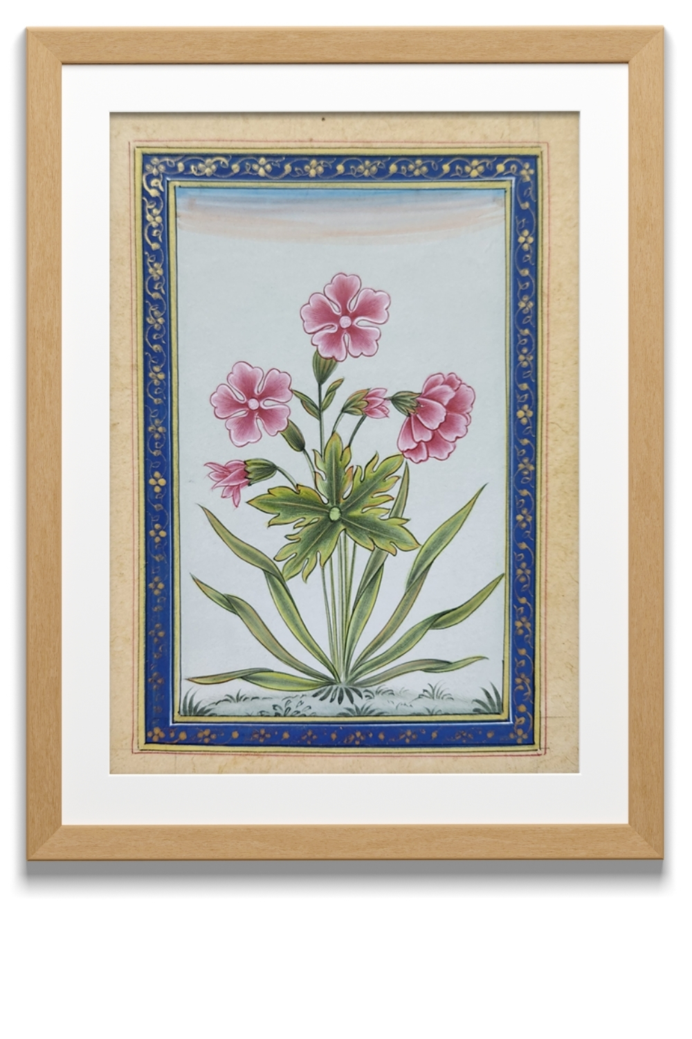 This exquisite miniature painting showcases a beautifully detailed flowering plant with pink blossoms. The artwork is framed with an ornate blue and gold border, enhancing its elegance. The painting features: