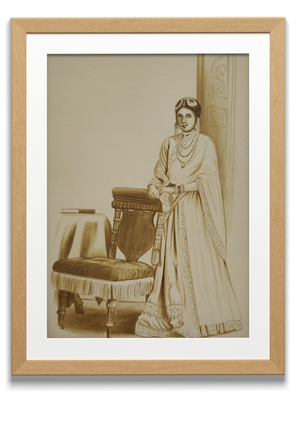 This exquisite sepia-toned watercolor painting captures the timeless elegance of a traditionally dressed figure standing beside an ornate chair and a table. The figure's face is intentionally obscured, directing focus towards the intricate details of the attire and surroundings. The painting features rich patterns on the clothing, layers of delicate jewelry, and carefully detailed furniture. A book placed on the table adds a touch of intellectual charm, while a decorative pillar in the background enhances the scene's classical ambiance.