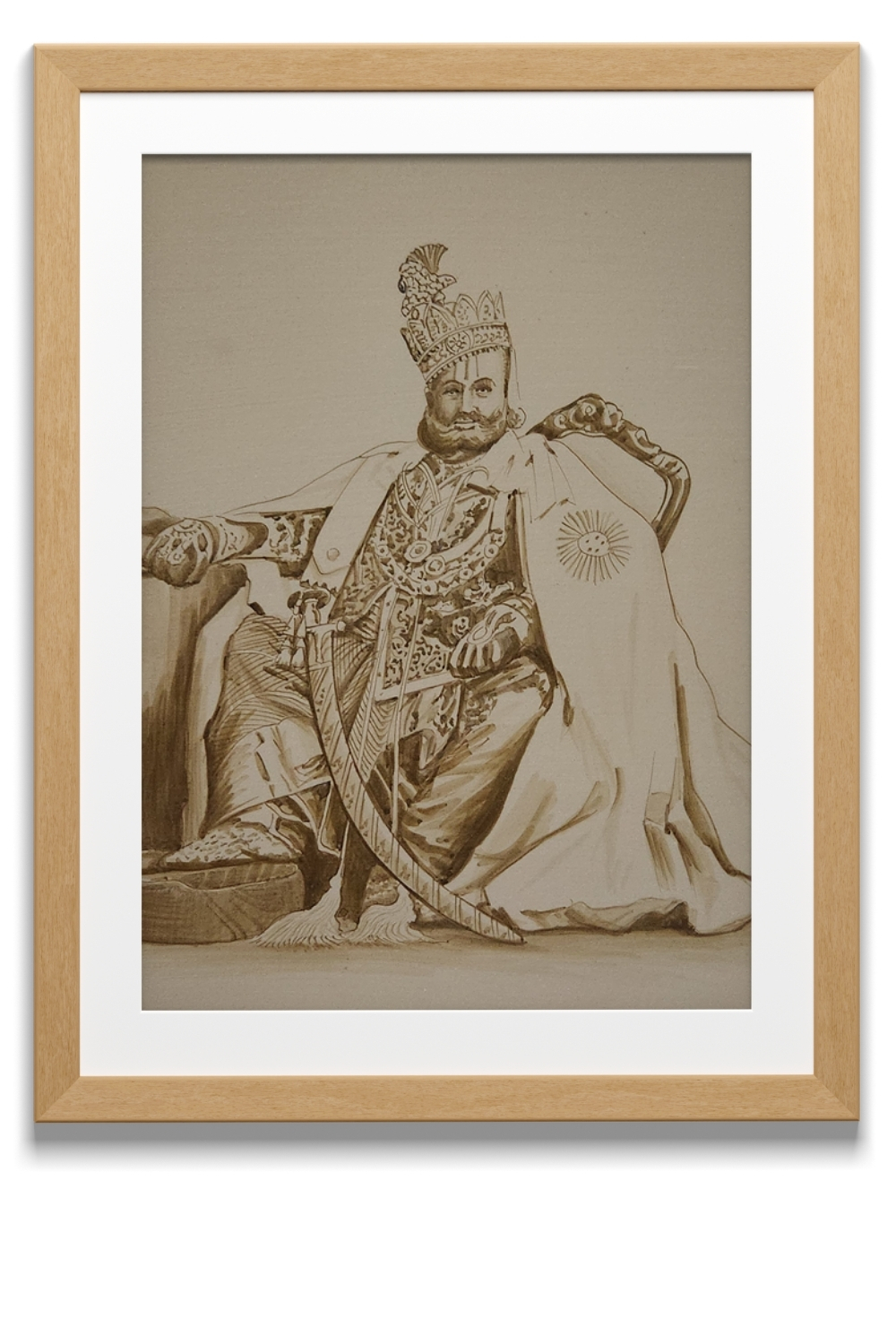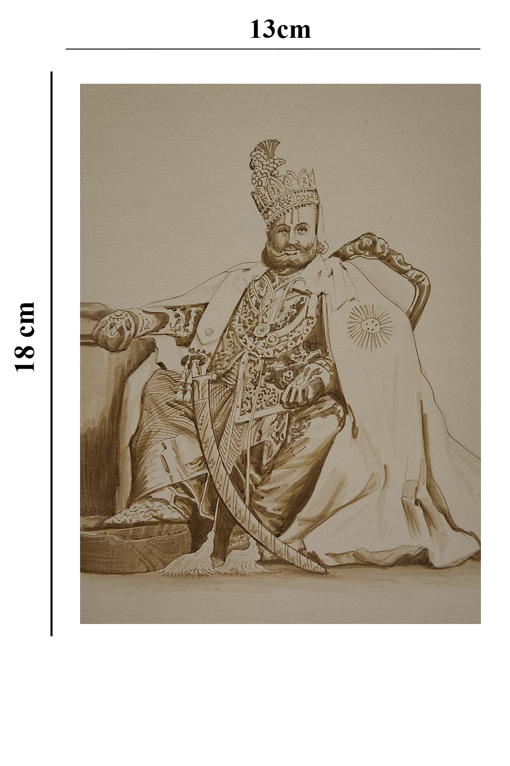 This sepia-toned watercolor painting captures the essence of regal elegance through its intricate depiction of a majestic figure seated on an ornate throne. The figure is adorned in traditional attire, featuring elaborate patterns and embellishments that highlight the grandeur of royal heritage. A prominent crown rests on the figure's head, symbolizing authority and power. The figure's posture and the ceremonial sword they hold add to the commanding presence. The sepia tones lend a vintage and timeless quality to the artwork, making it a captivating piece that evokes historical grandeur.