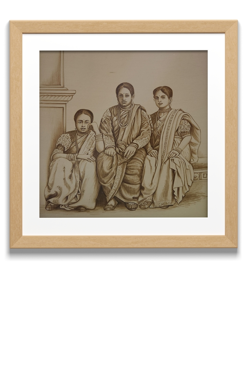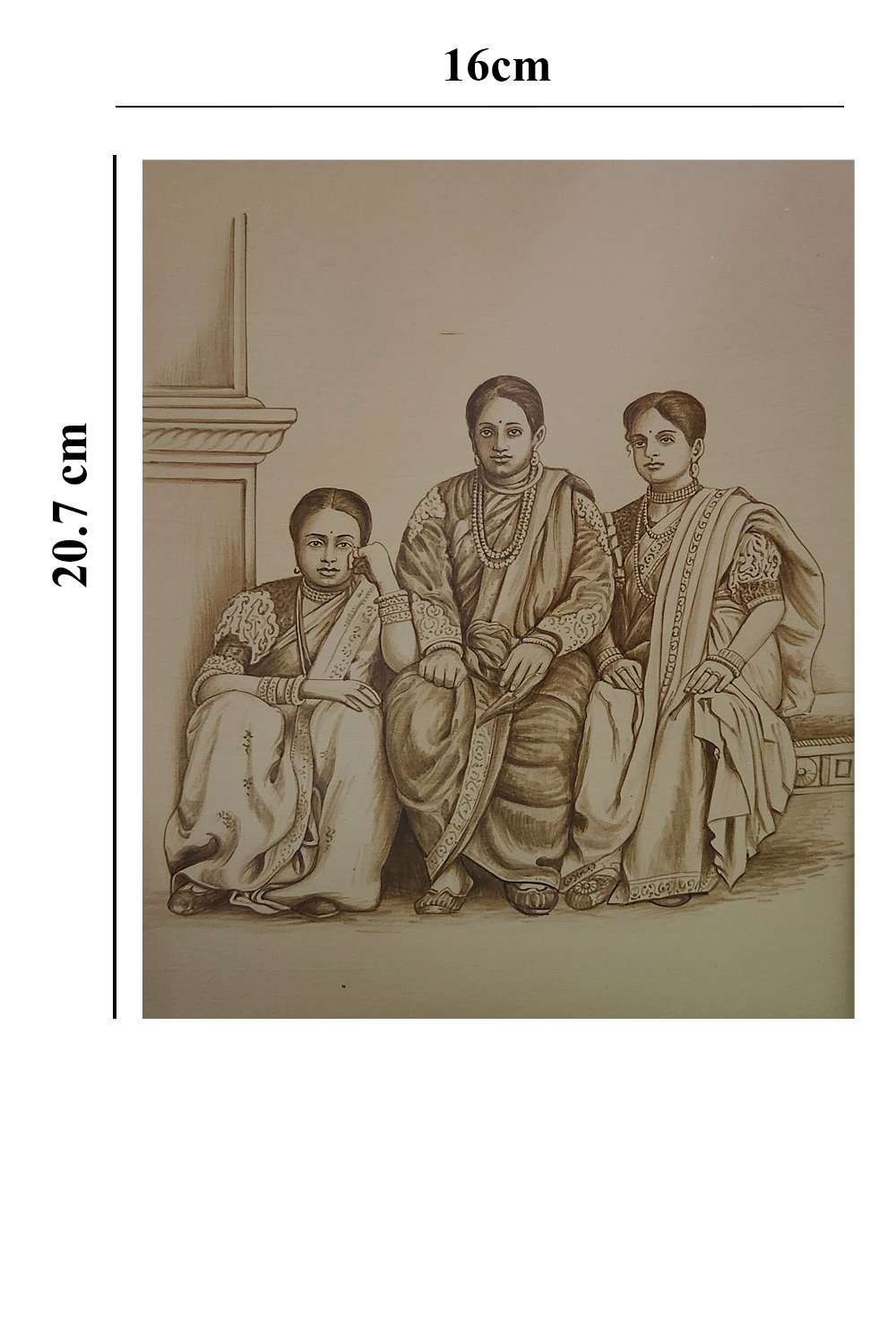 This sepia-toned artwork captures a moment of historical significance, featuring three individuals adorned in traditional attire. The painting is characterized by: