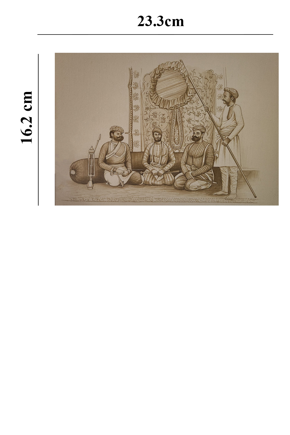 This sepia-toned artwork captures a traditional scene featuring four individuals, three seated and one standing, against a backdrop adorned with intricate patterns and cultural artifacts. The painting is rich in detail and offers a glimpse into traditional attire and communal life. The seated figures are dressed in traditional clothing, while the standing individual holds a long staff, adding to the scene's historical significance. A large, ornate fan or ceremonial object hanging in the background enhances the cultural context. The detailed patterns and traditional musical instruments placed beside one of the seated individuals further add to the richness of the scene.