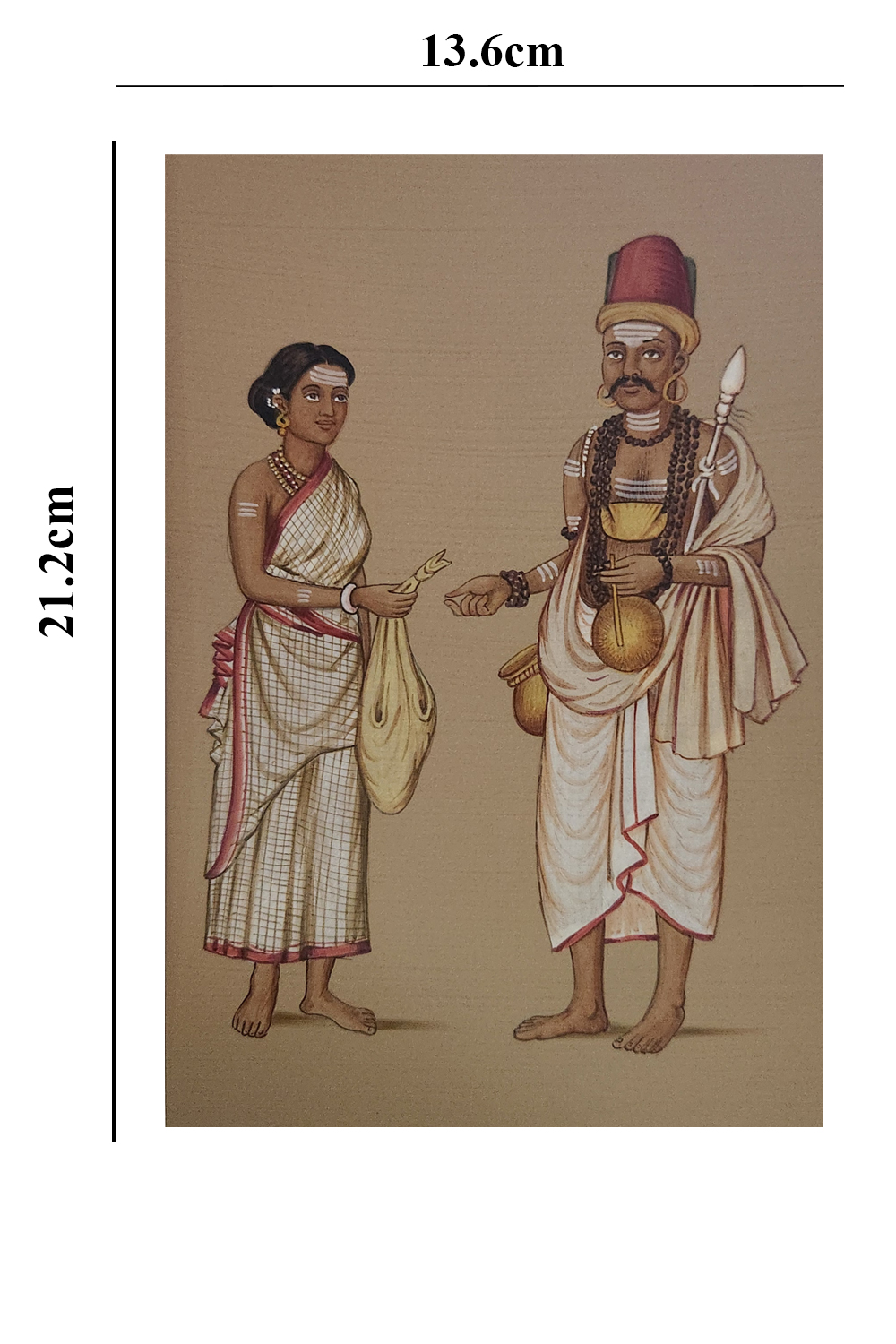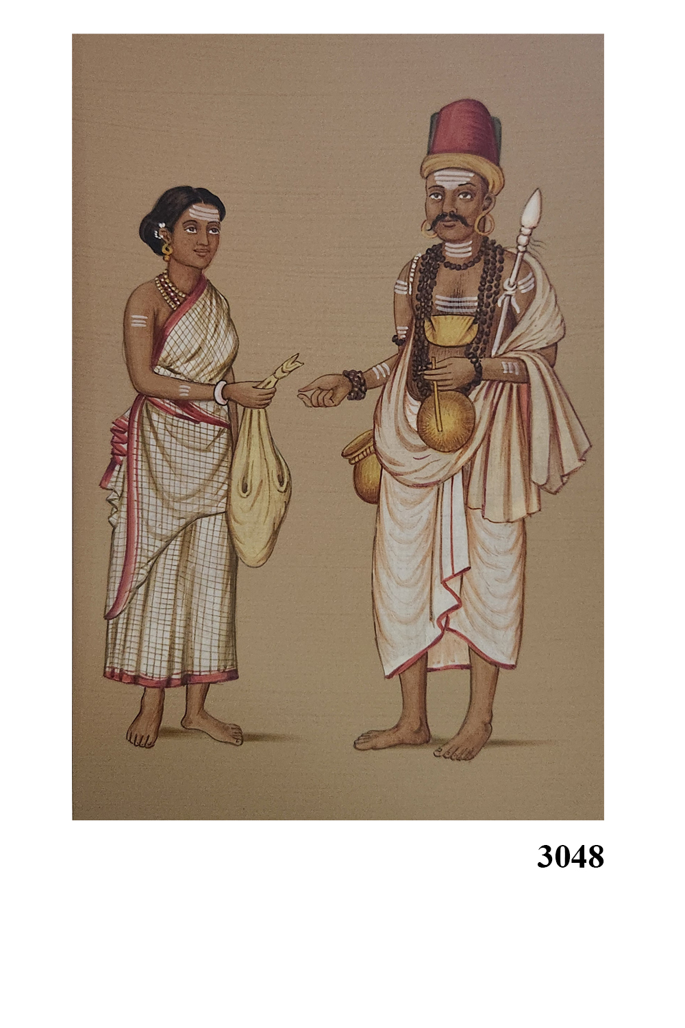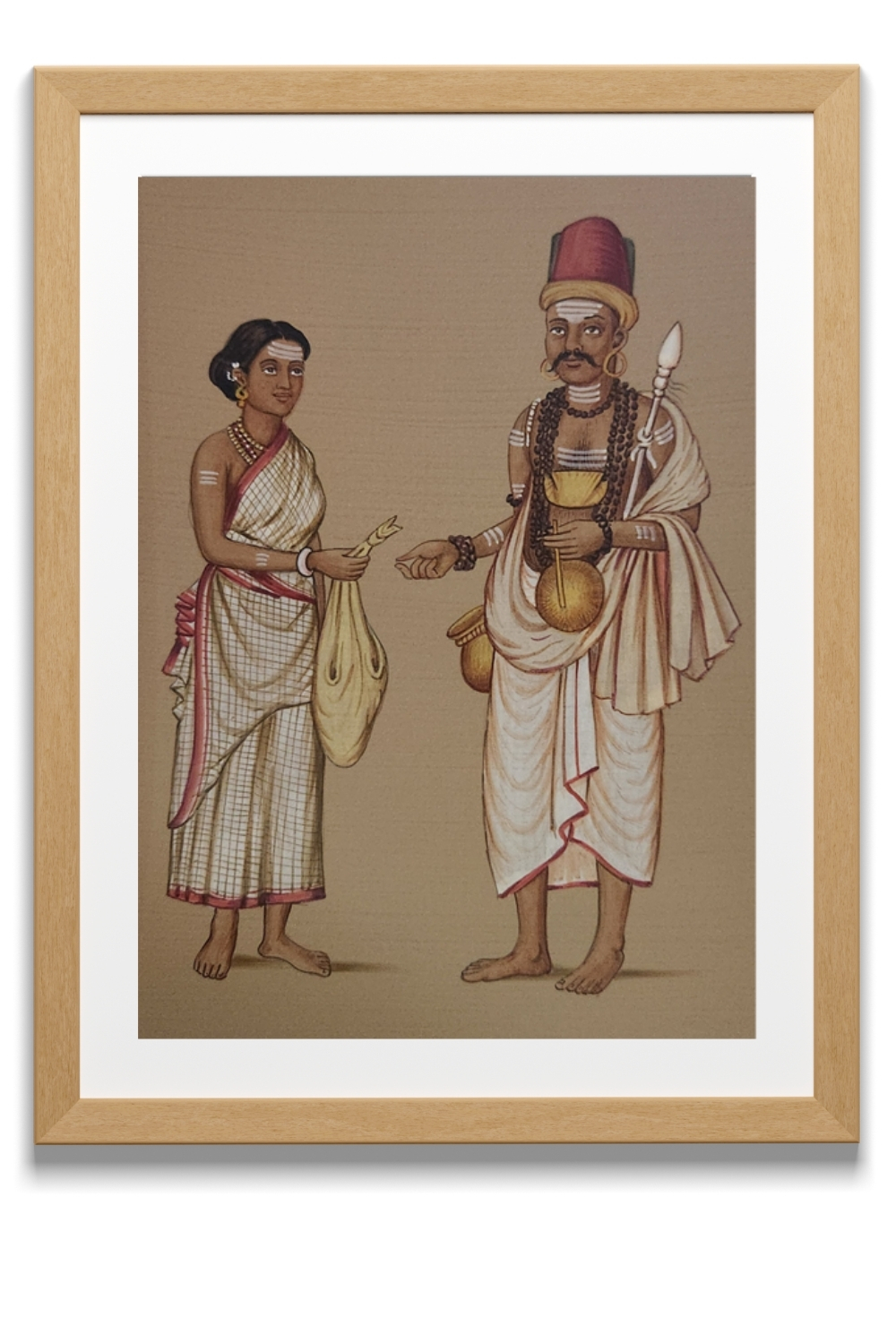 This watercolor painting captures a moment of cultural exchange between two individuals dressed in traditional attire. The person on the left is wearing a checked saree with a red border and is holding a bag and a feather. The person on the right is adorned in a white dhoti and shawl, accessorized with multiple necklaces, a headgear, and holding a staff and a gourd. The painting highlights: