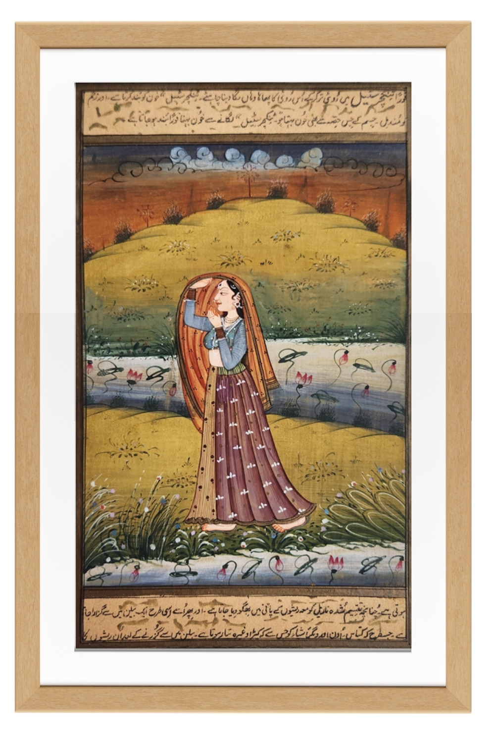 Border: Text in a script, possibly narrating a story or poem related to the scene.