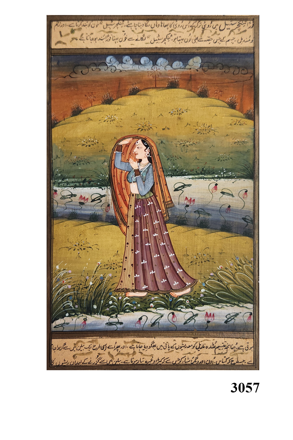 This exquisite miniature painting captures the elegance and tranquility of a lady standing by a lotus pond. The artwork is rich in detail and vibrant colors, showcasing the following features: