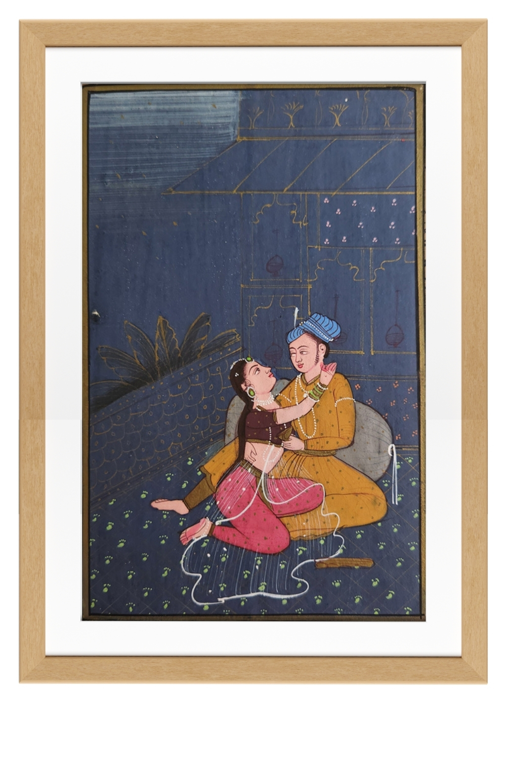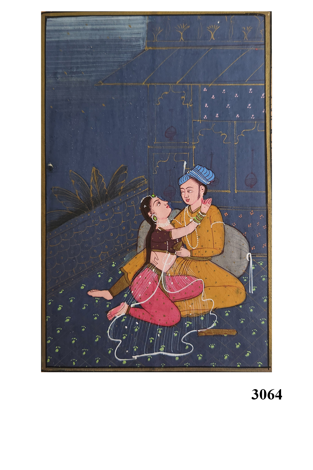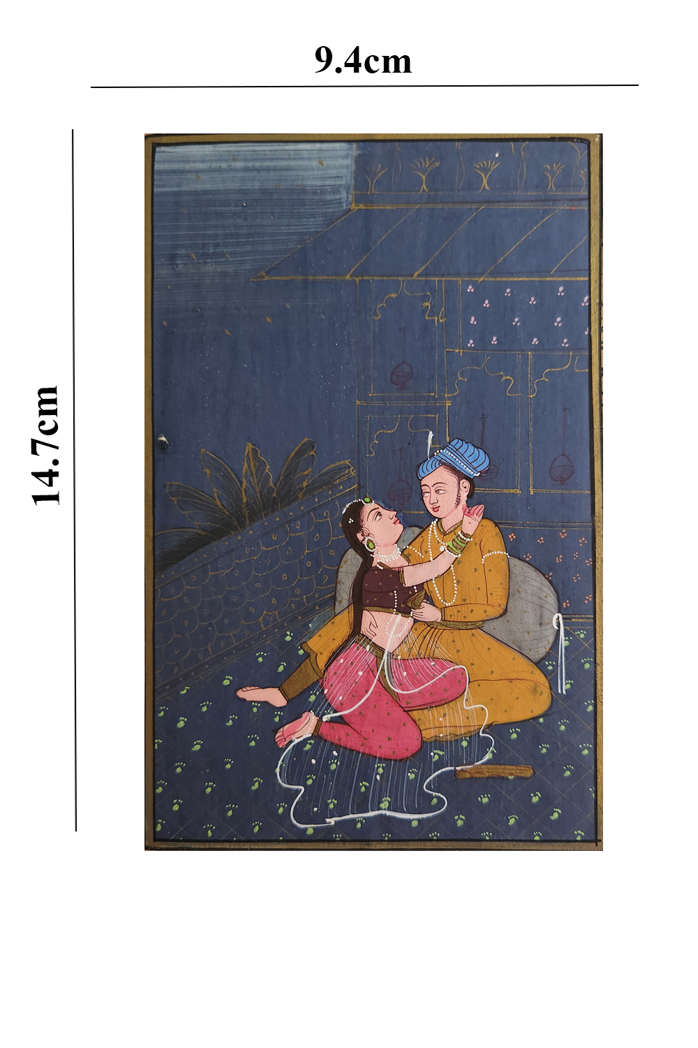 This exquisite miniature painting captures a tender moment between a couple, rendered in the traditional Indian style. The painting features: