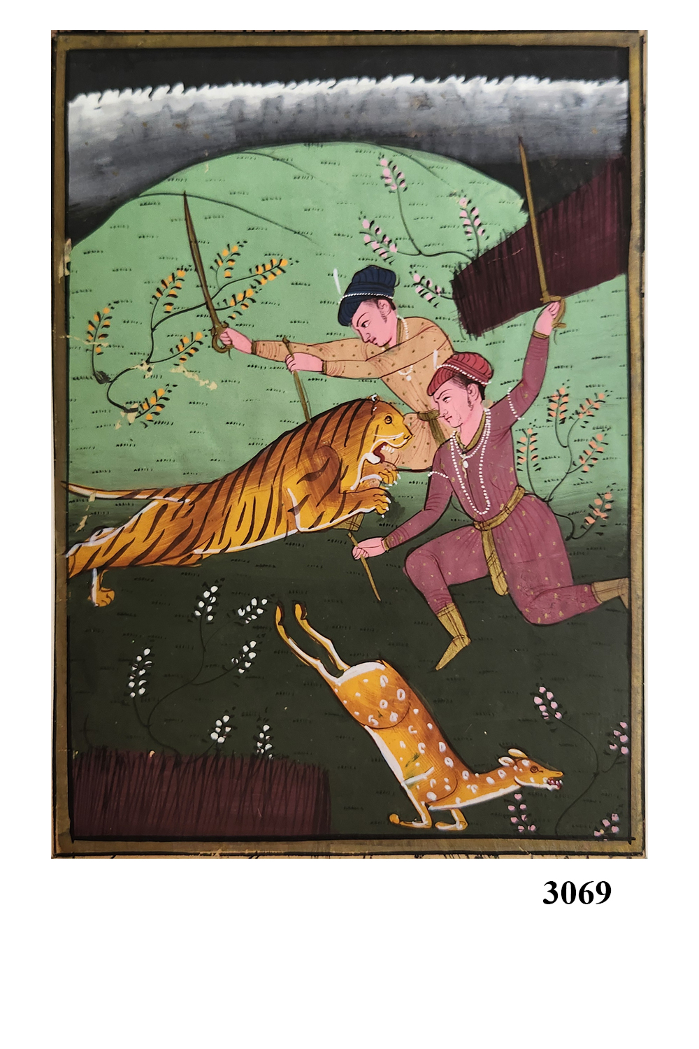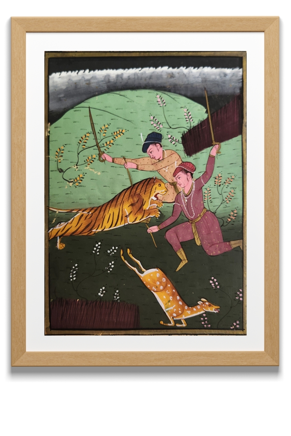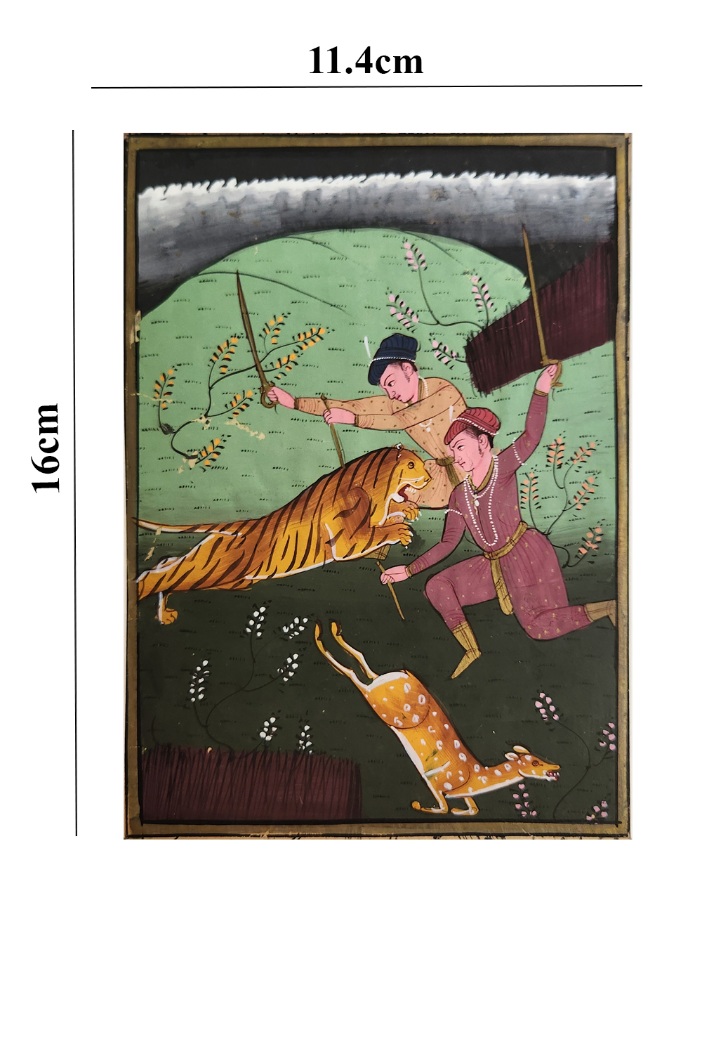 This exquisite miniature painting captures a dynamic scene of a royal tiger hunt, showcasing the rich tradition of hunting in historical times. The painting features: