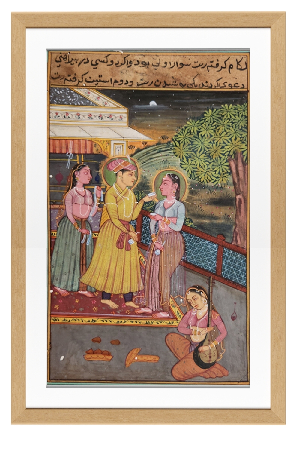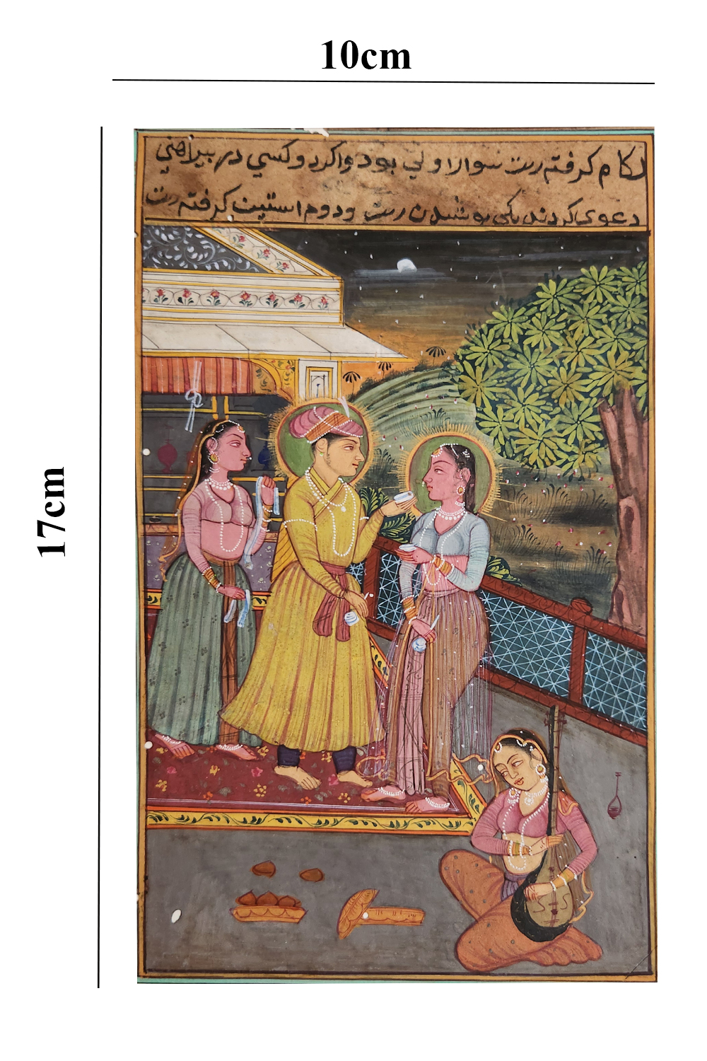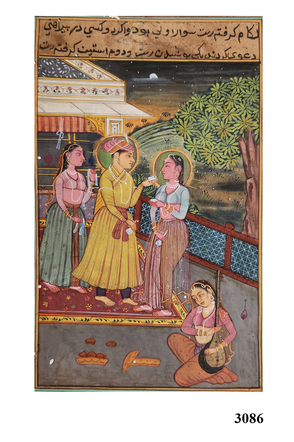 This exquisite miniature painting captures a vibrant royal court scene set against a serene night sky. The painting features: