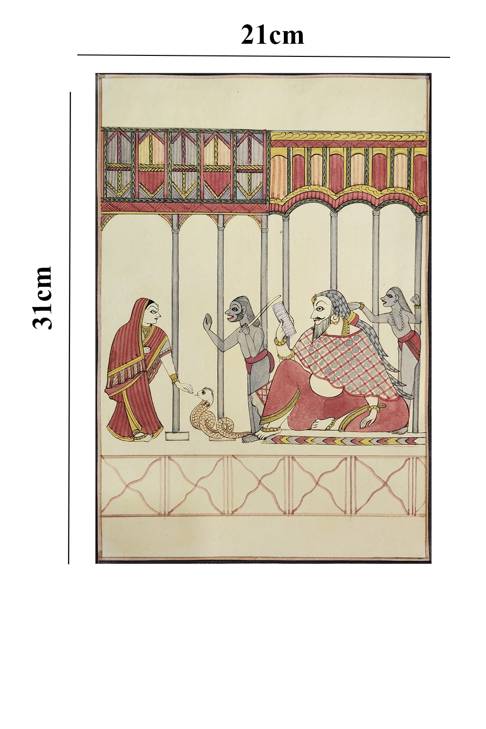 This Indian School painting illustrates a vivid royal scene. The king, seated on a platform, is attended by two servants, one of whom is holding a fan. A woman, dressed in traditional attire, stands before the king, presenting a snake. The architectural elements in the background, with their intricate designs and vibrant colors, add depth to the scene. The painting showcases: