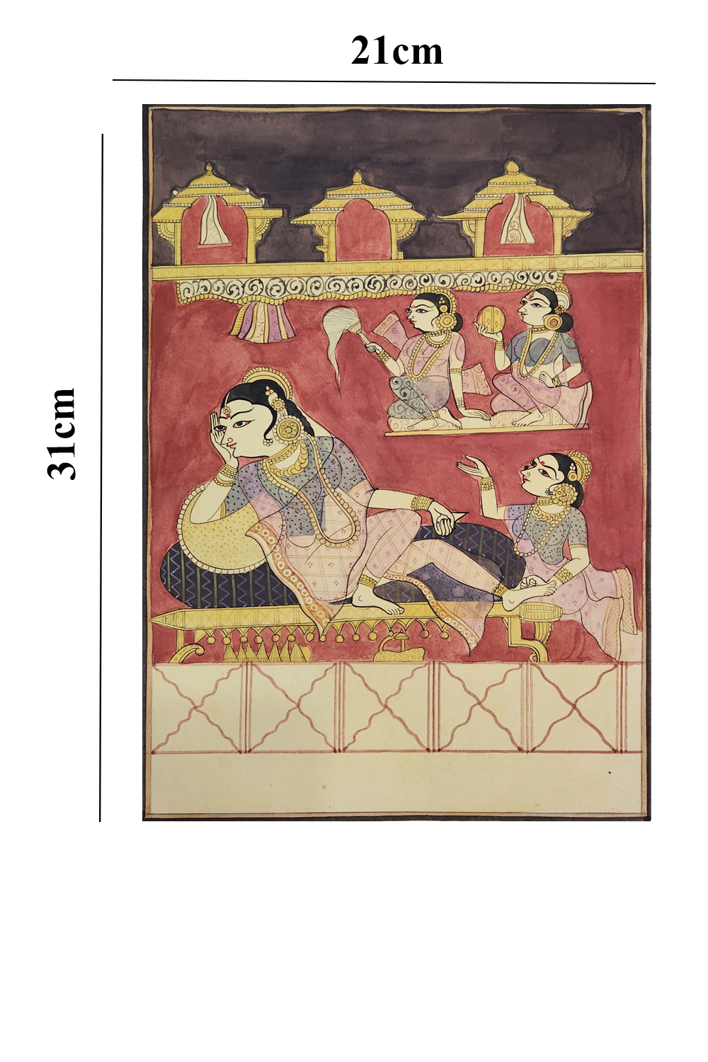 This painting is a fine example of Indian miniature art, showcasing a royal court scene. The artwork features: