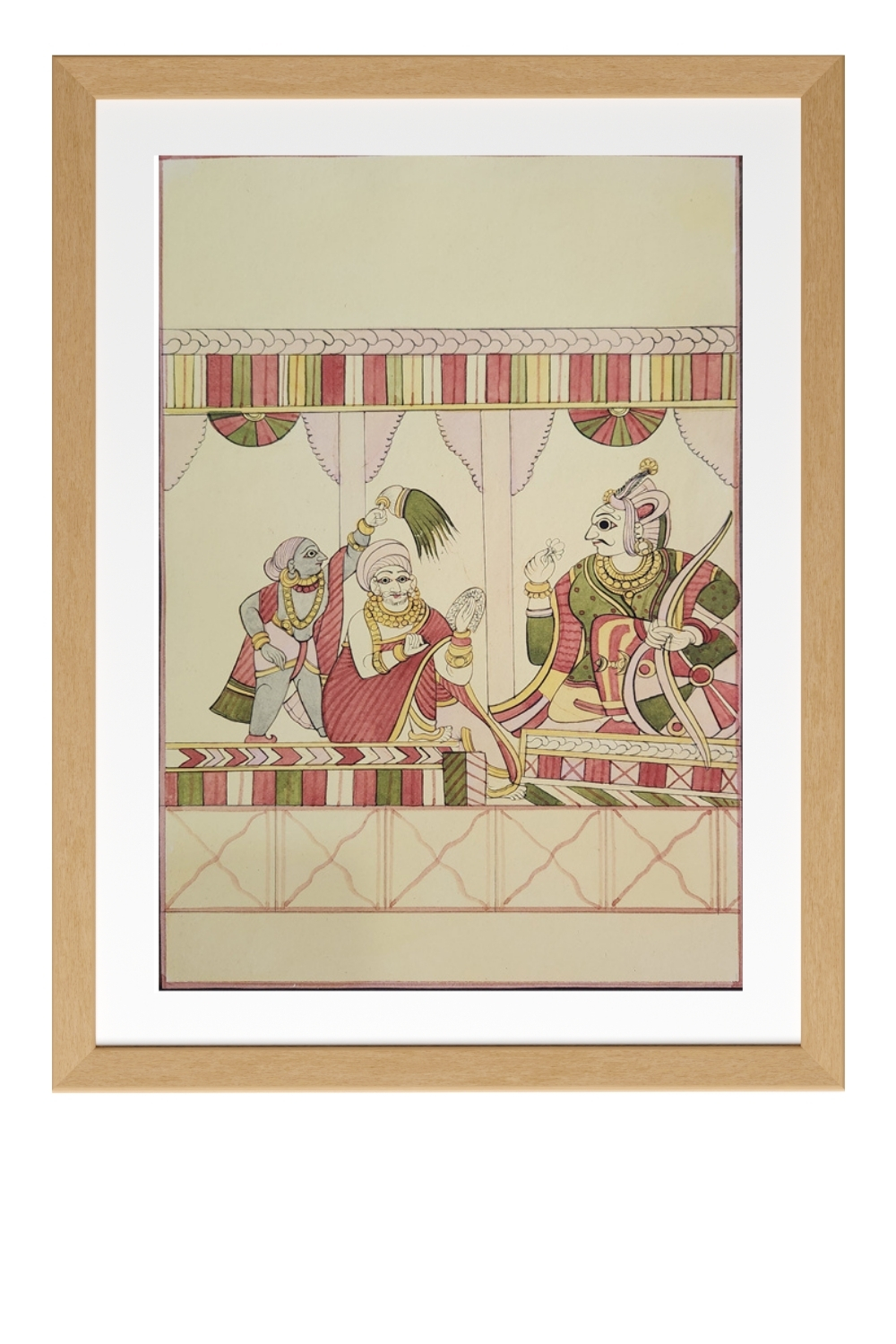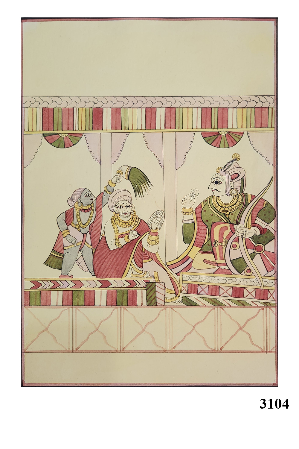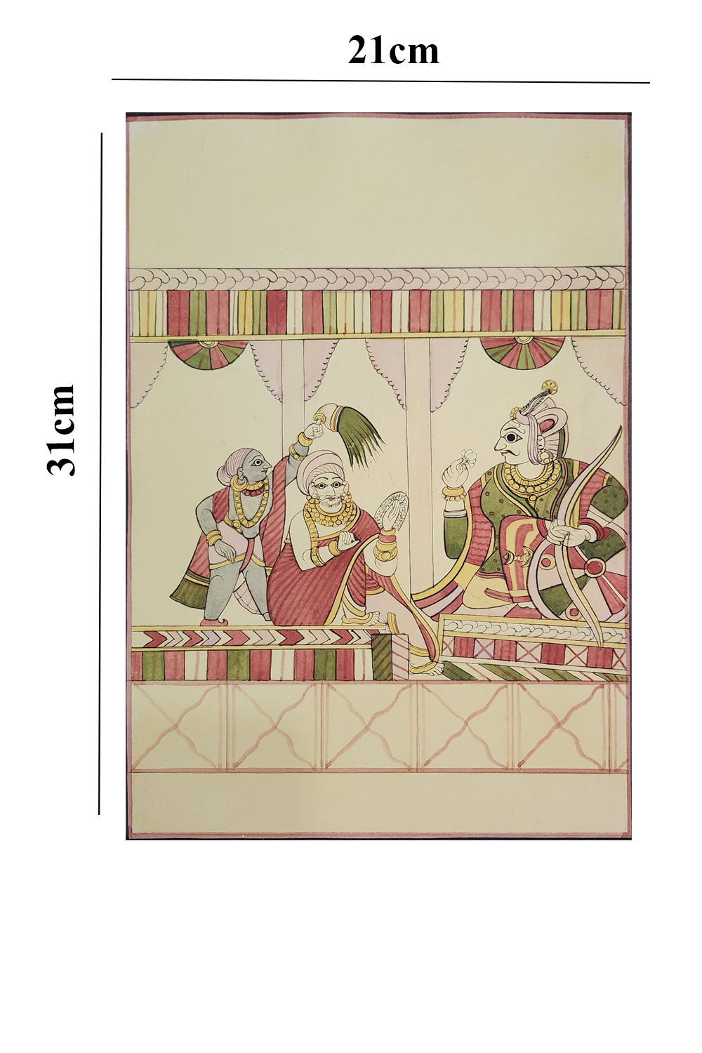 The use of muted yet vibrant colors, primarily red, green, and gold, which are characteristic of Indian miniature paintings.