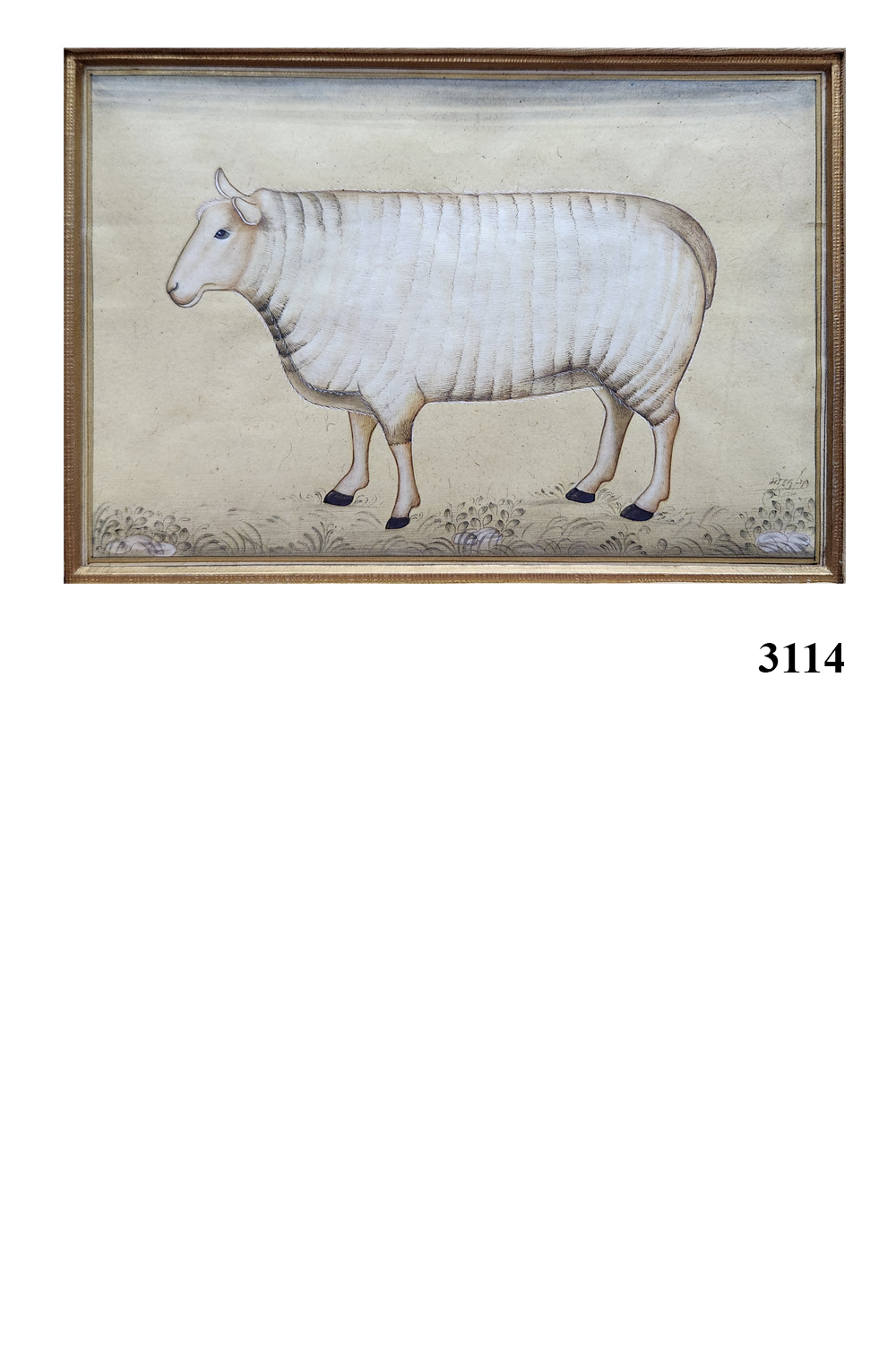 This exquisite miniature painting, titled "The Majestic Sheep," captures the serene and dignified presence of a sheep in a pastoral setting. The painting is characterized by:
