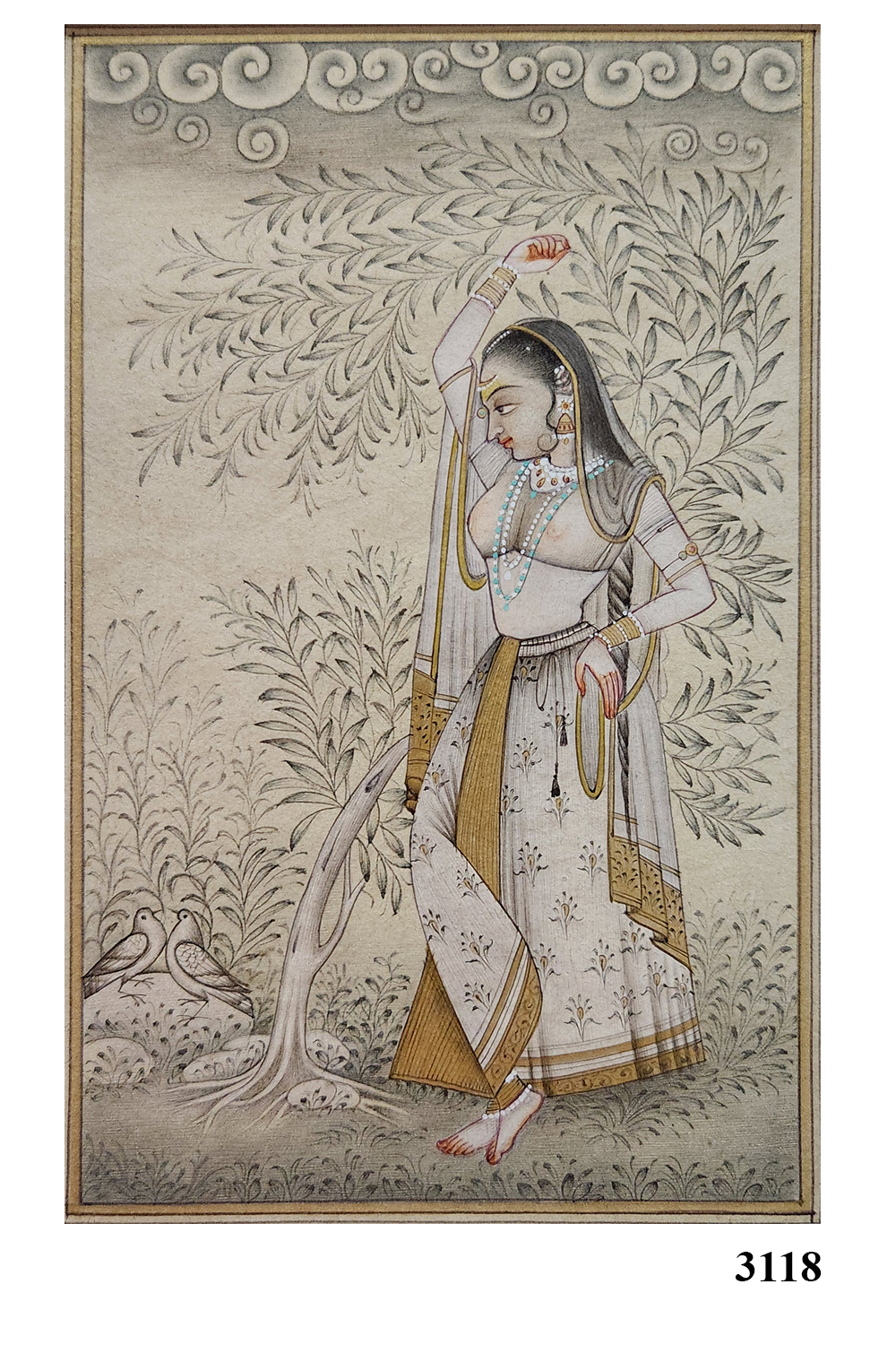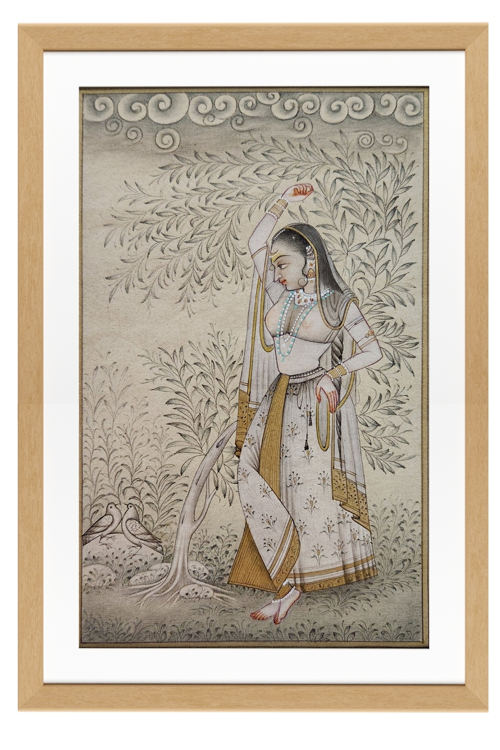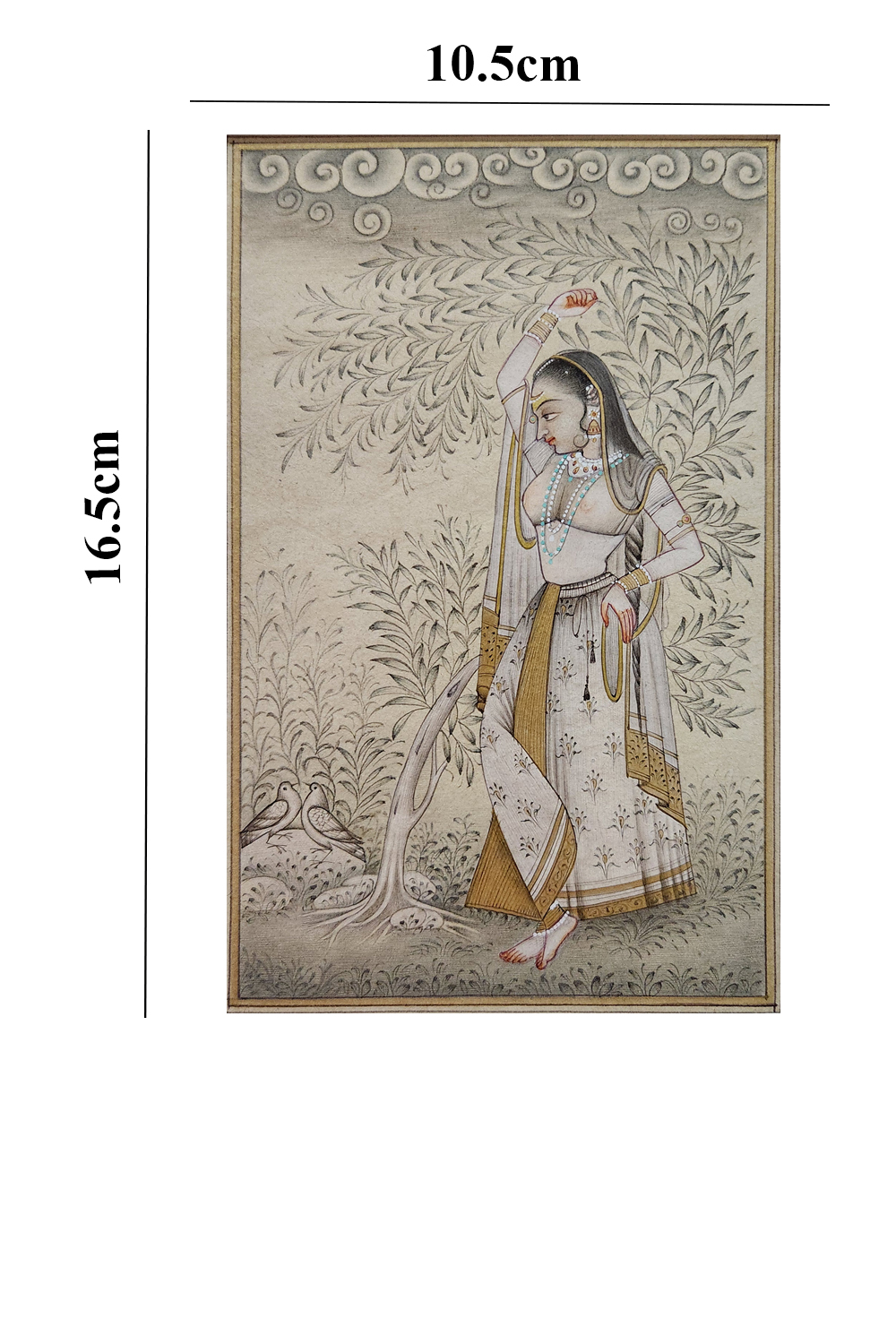 This exquisite miniature painting showcases a lady adorned in traditional attire, standing gracefully with one arm raised. The background is filled with intricate foliage and cloud motifs, adding depth and elegance to the scene. The lady's attire is richly detailed with patterns and accessories, including a necklace and bangles, highlighting the artist's attention to detail. The painting captures the essence of traditional beauty and cultural heritage, making it a captivating piece of art.