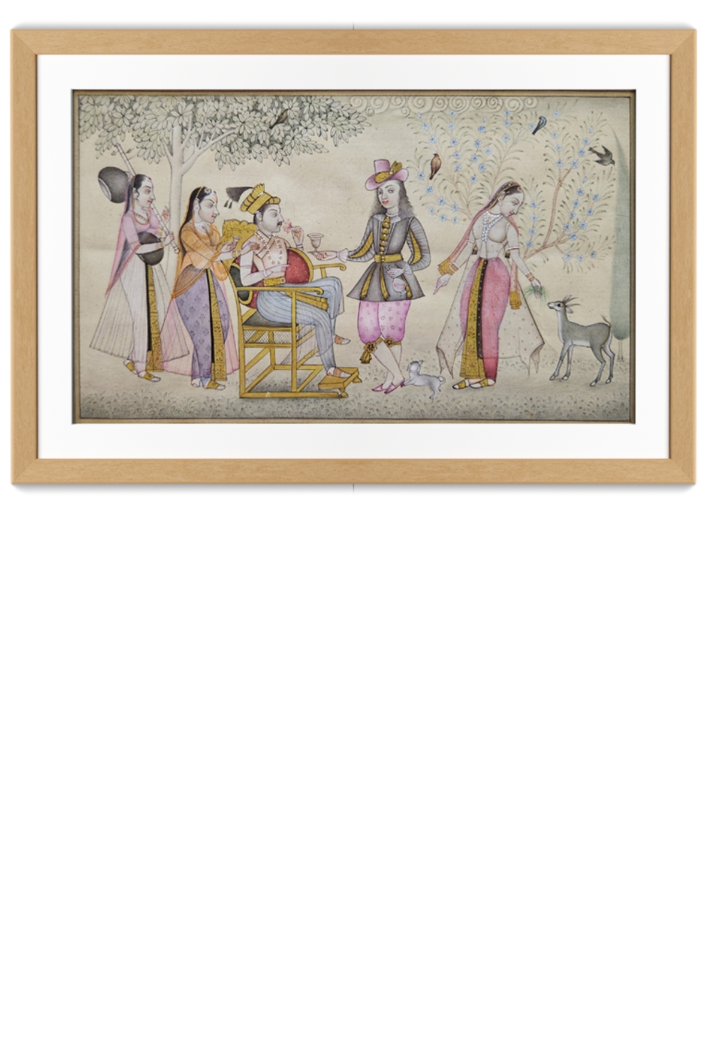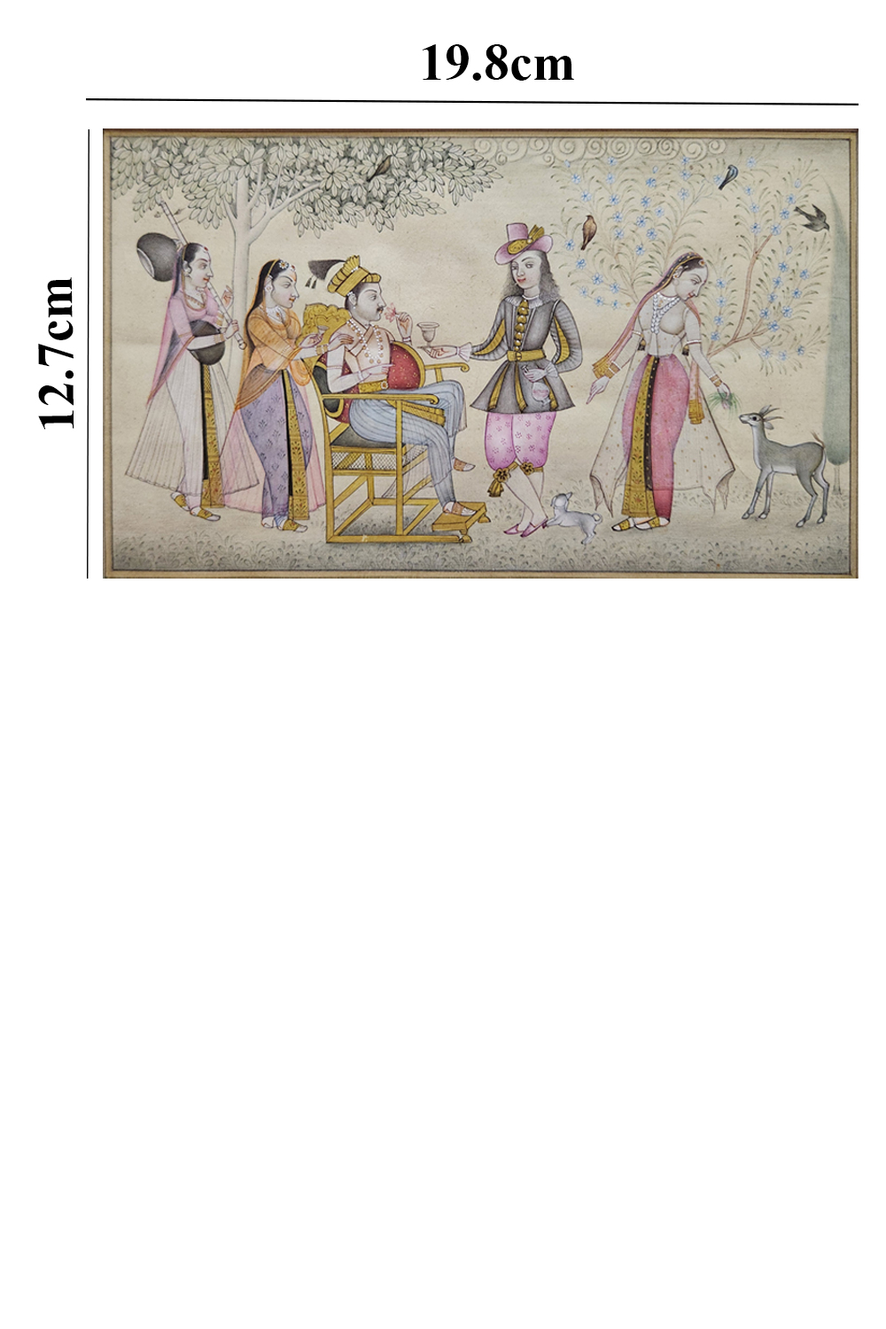 This exquisite miniature painting captures a serene royal court scene, showcasing the opulence and elegance of the era. The painting features: