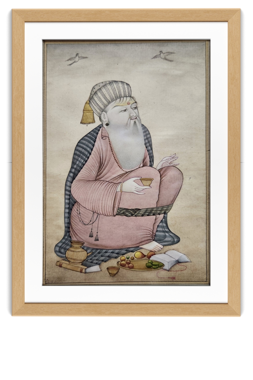 This exquisite miniature painting portrays a sage seated in a contemplative pose, holding a cup. The sage is adorned in a pink robe with intricate patterns and a striped shawl draped over the shoulders. The background is minimalistic with two birds flying, adding a serene ambiance. The sage is surrounded by various objects, including a book, fruits, and a vessel, symbolizing knowledge and sustenance. The painting is rich in detail and captures the essence of tranquility and wisdom.