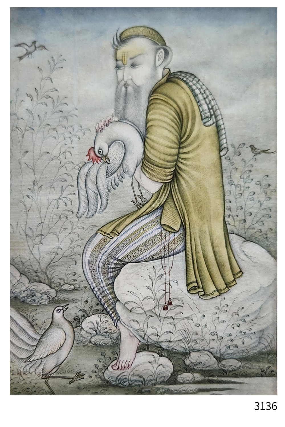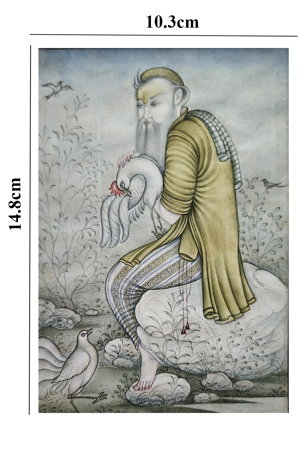 This exquisite miniature painting captures a tranquil scene where a figure is seated on a rock, tenderly holding a swan. The painting is rich in detail and features: