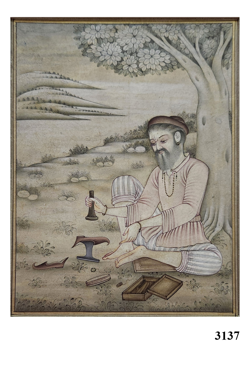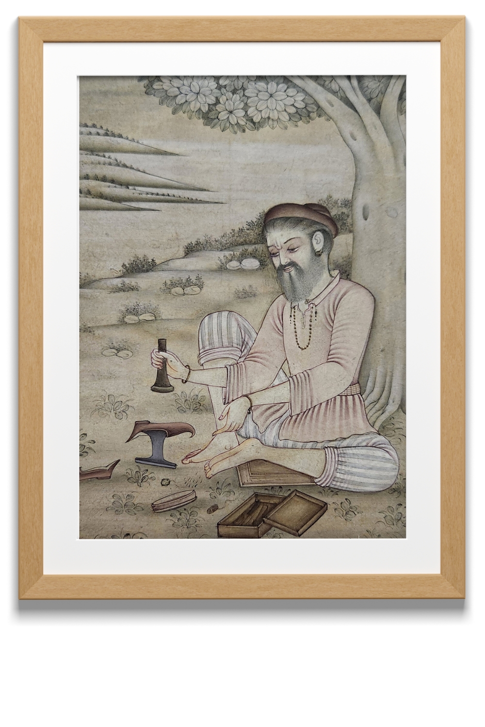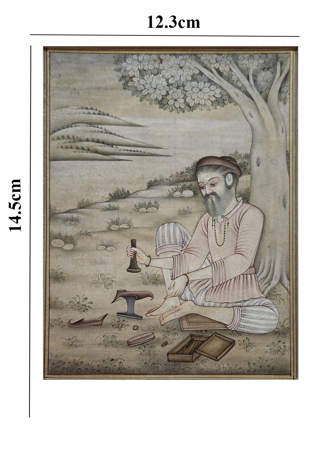 This exquisite miniature painting captures an artisan deeply engrossed in his work, set against a serene outdoor backdrop. The painting features: