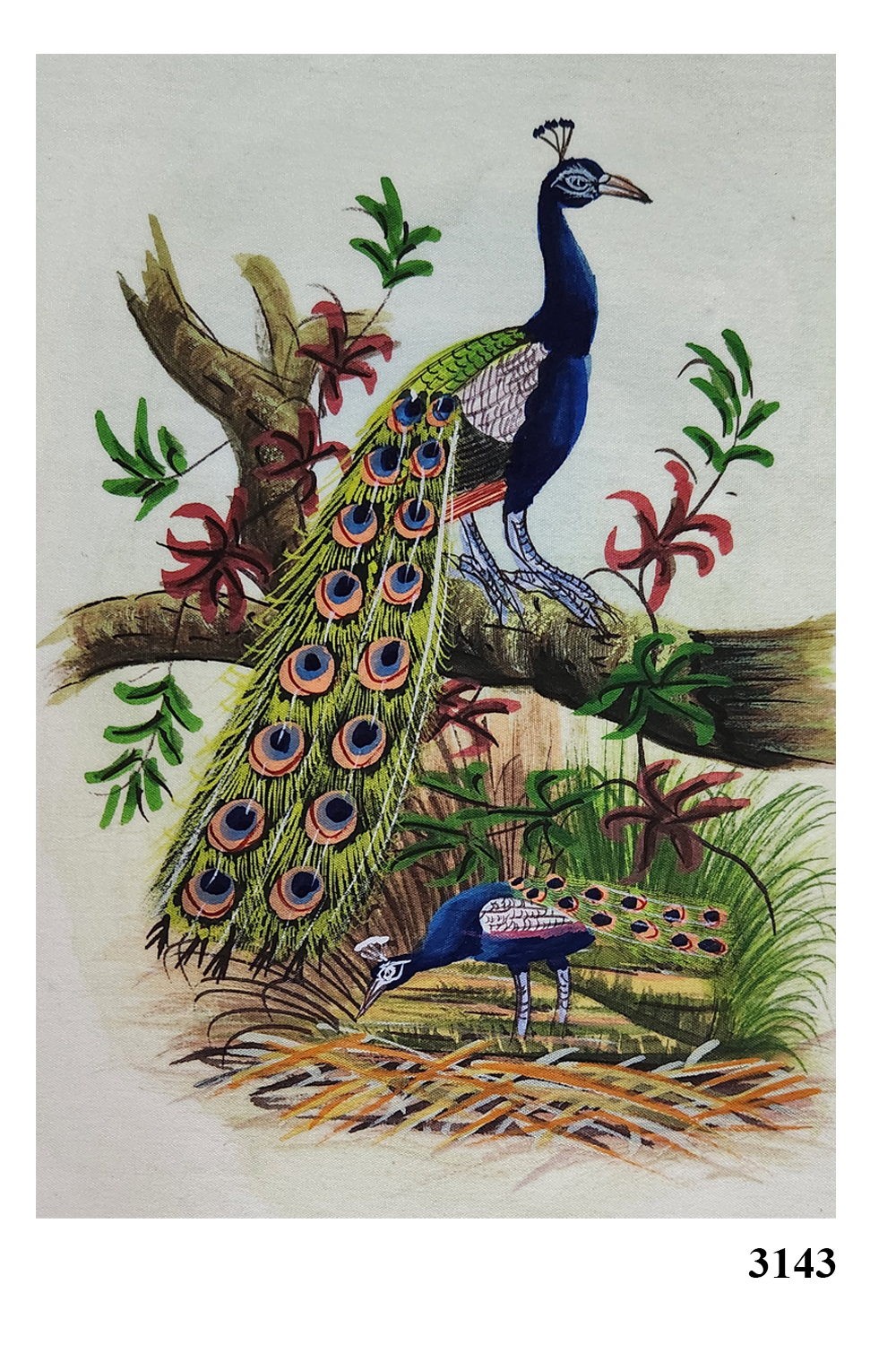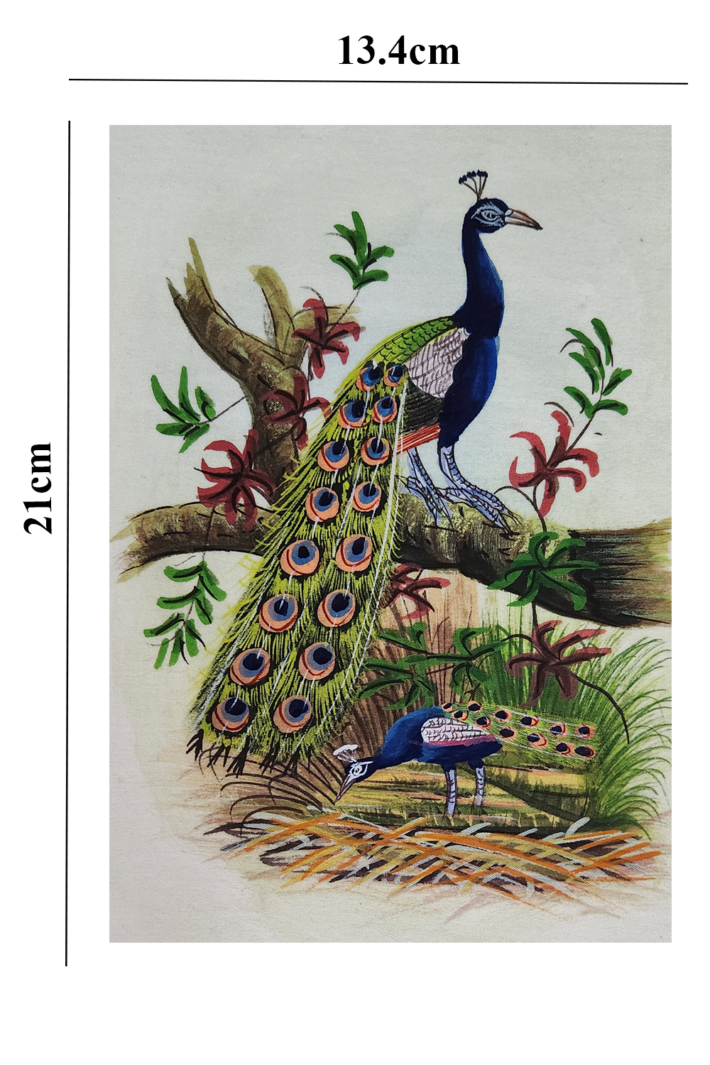 This exquisite water painting captures the elegance of two peacocks in a natural setting. The painting features: