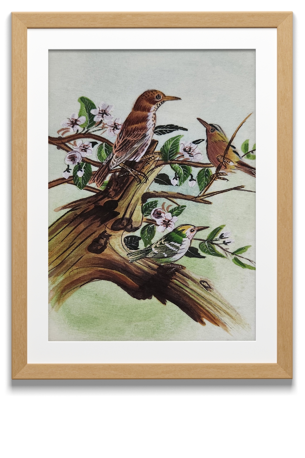 Detailed brushwork that highlights the texture of the birds' feathers and the tree bark.