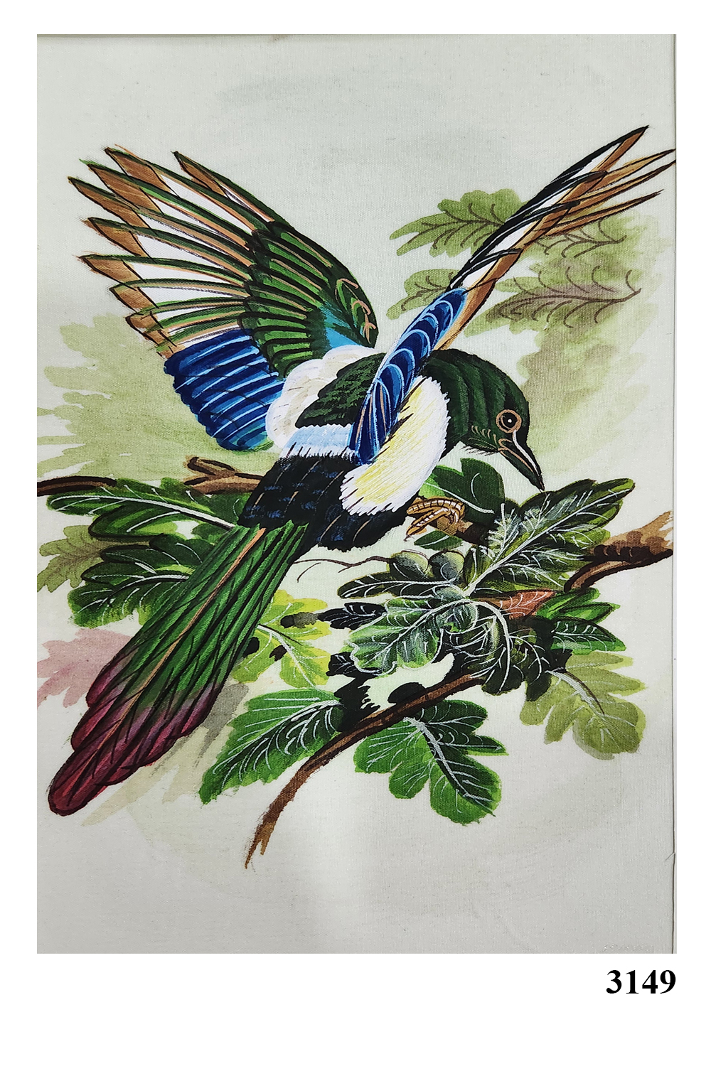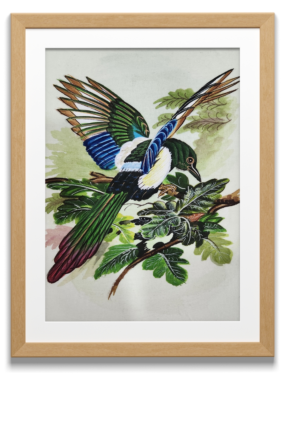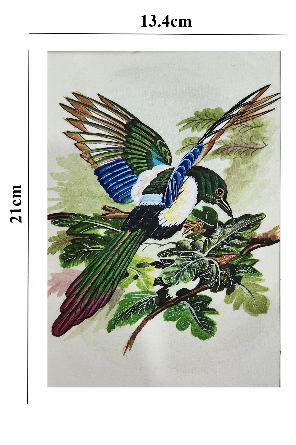 This exquisite water painting captures the dynamic beauty of a magpie in flight. The artist has skillfully used a blend of vivid colors and intricate details to bring the scene to life. Key features include: