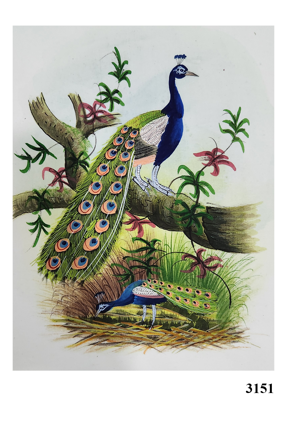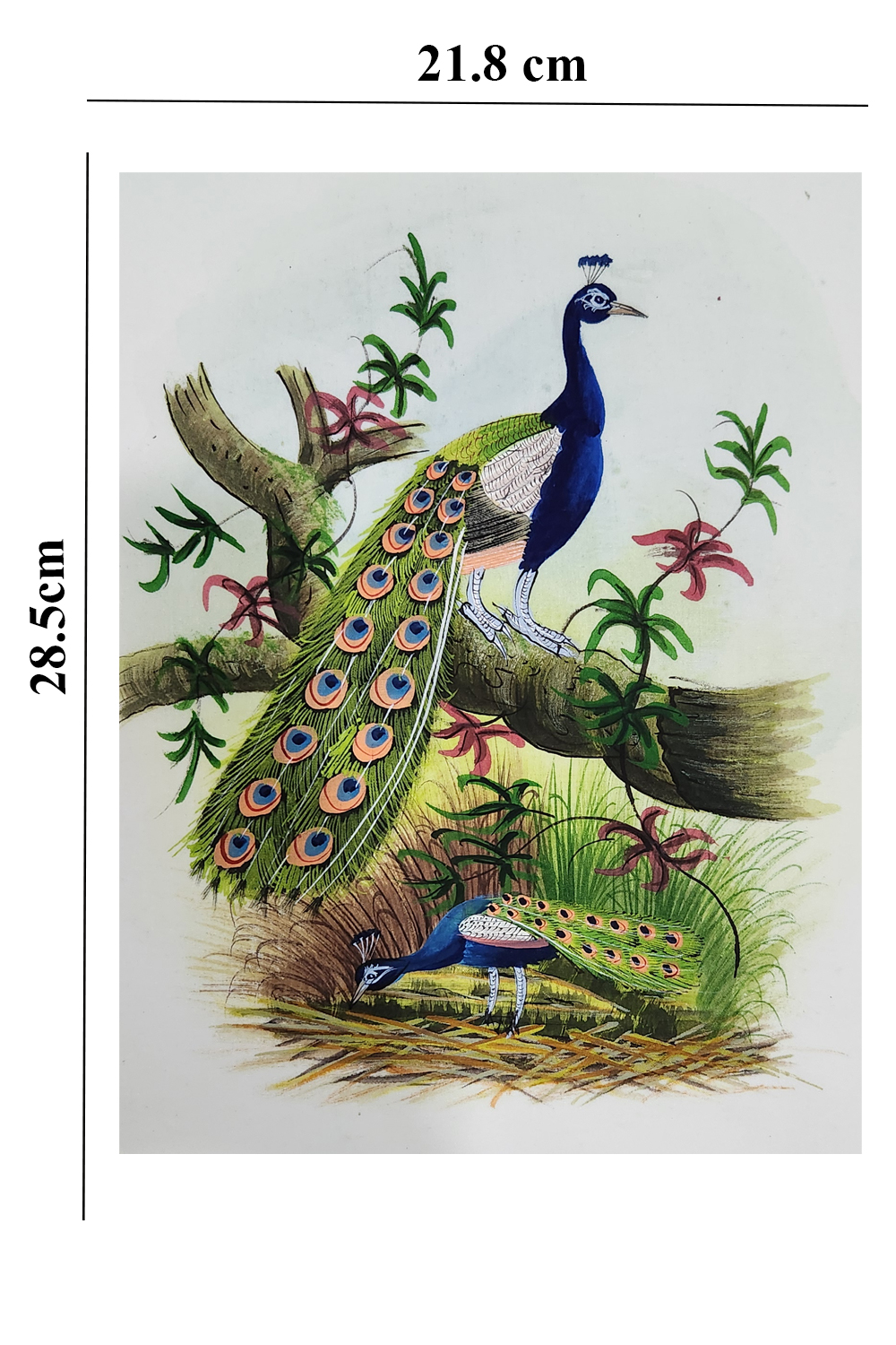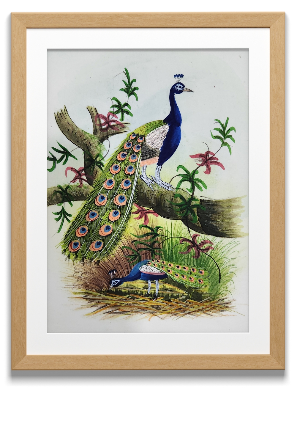 This exquisite watercolor painting captures the elegance and beauty of two peacocks in a serene garden setting. The painting features: