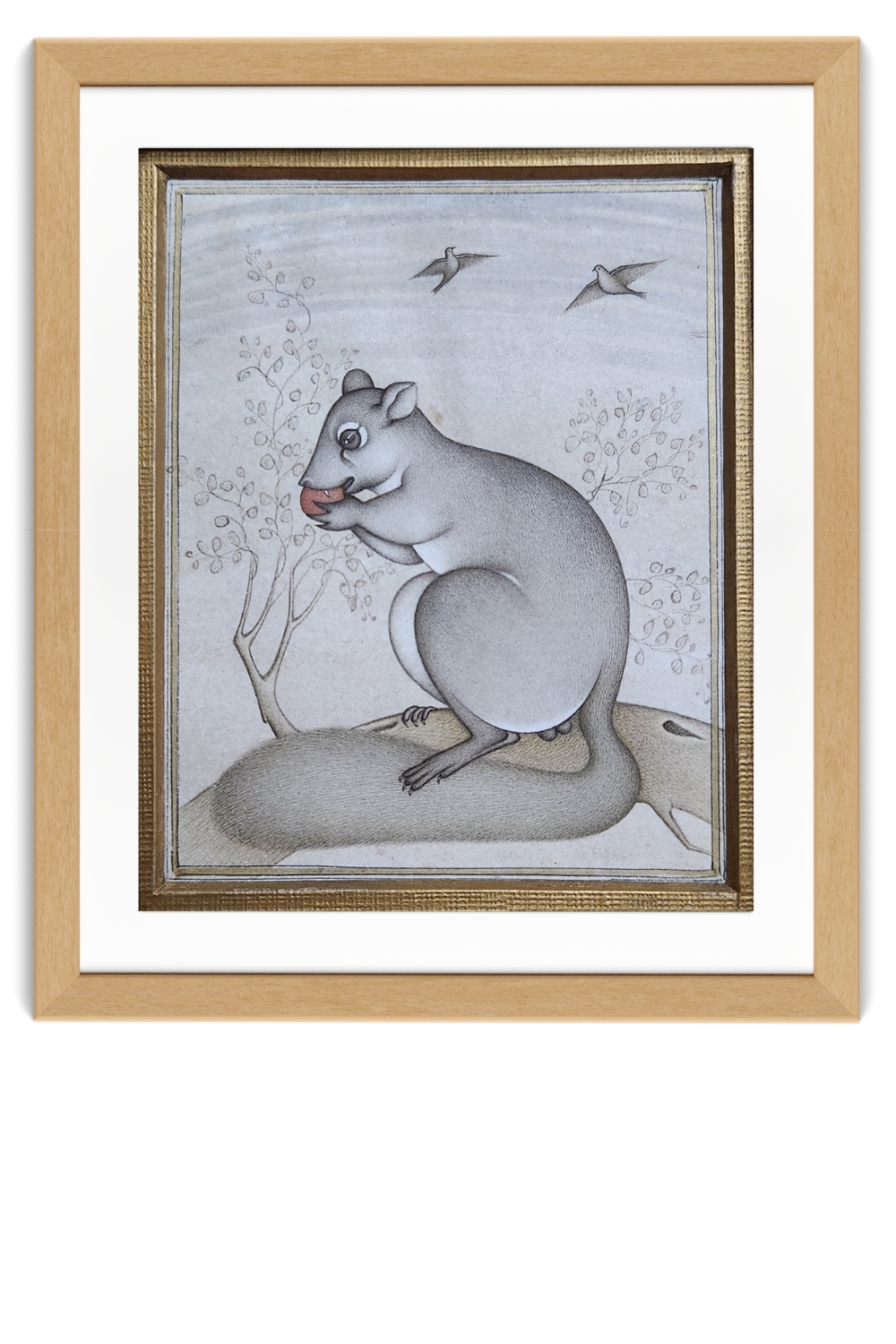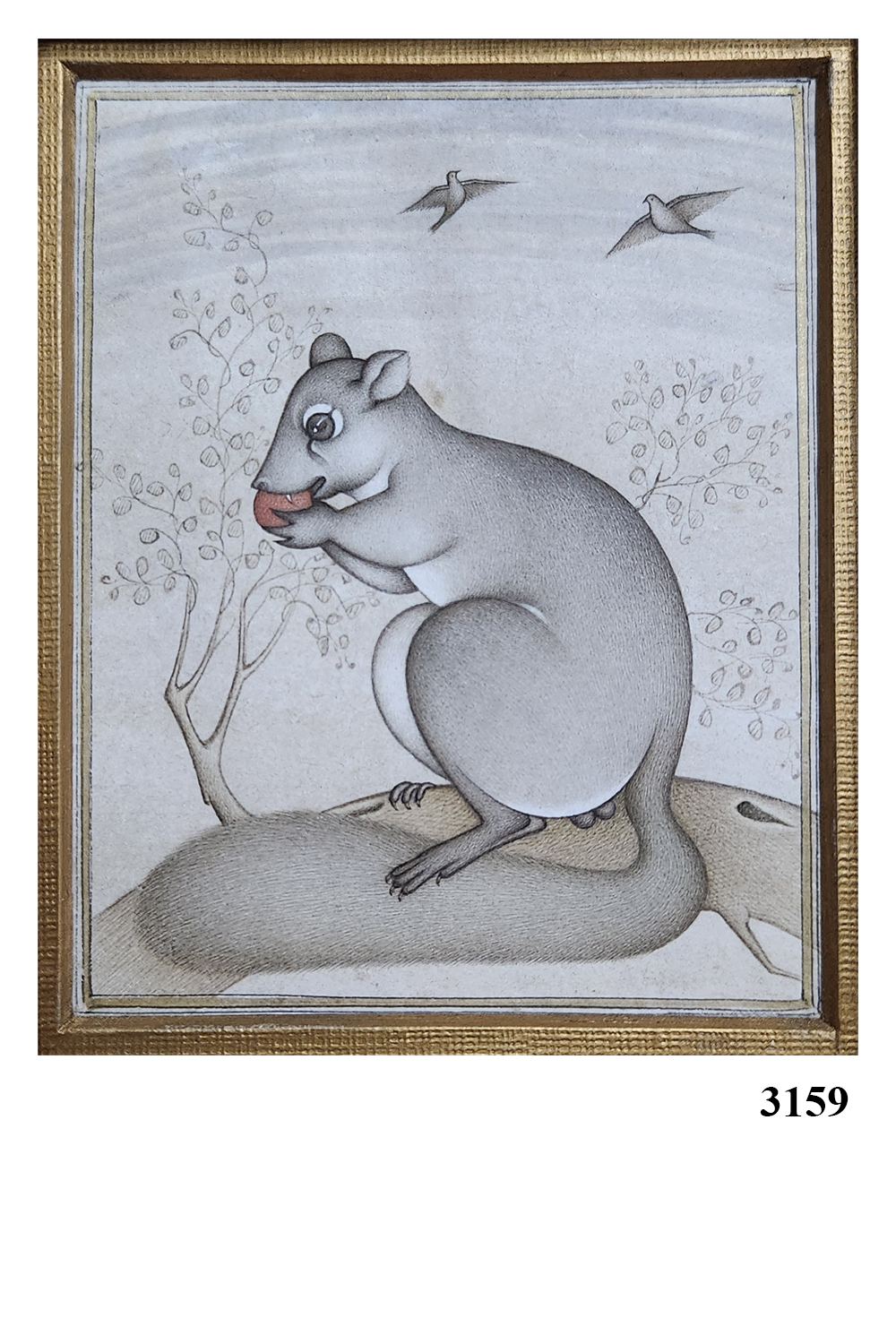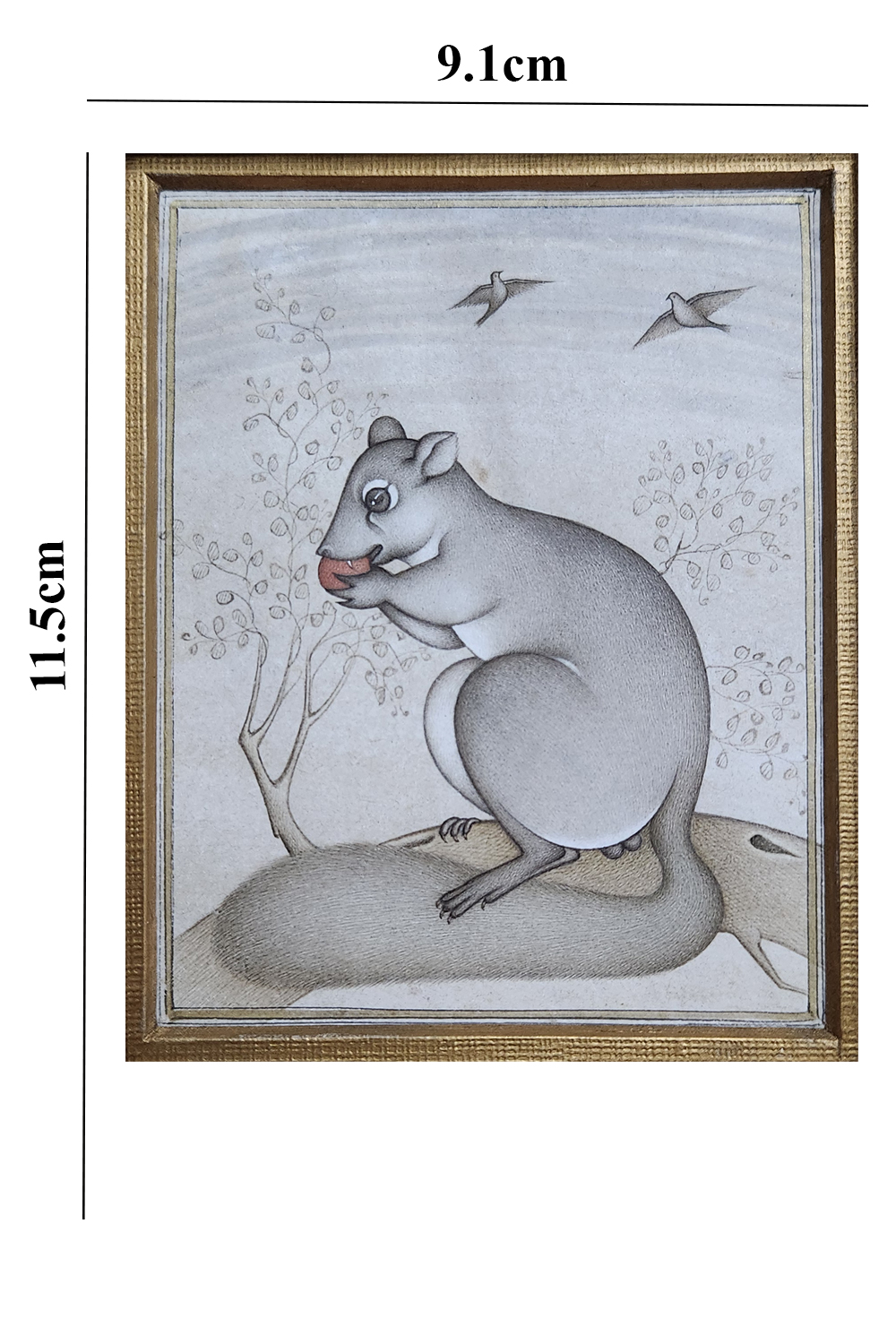 This exquisite miniature painting captures a serene scene featuring a rodent perched on a rock, seemingly lost in thought. The background is adorned with delicate trees and two birds in flight, adding a sense of tranquility and depth to the composition. The rodent is depicted with meticulous attention to detail, showcasing its fur texture and expressive eyes. The use of soft, muted colors enhances the peaceful ambiance of the artwork. Key features include: