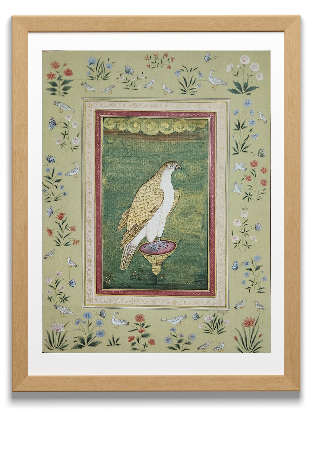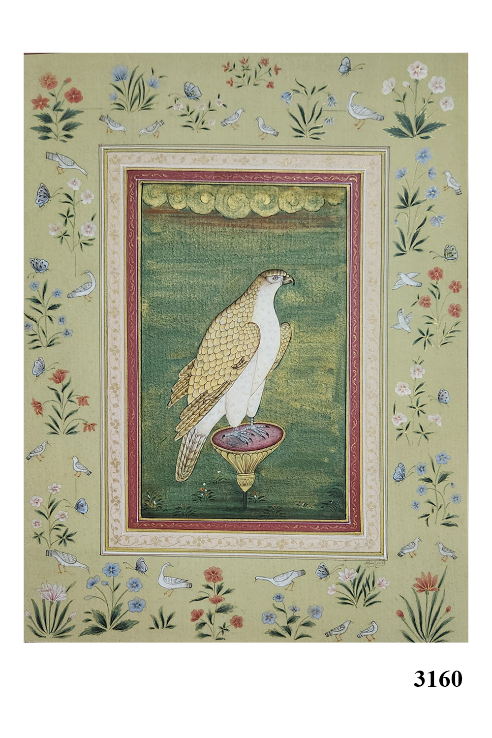 This exquisite miniature painting showcases a majestic falcon, meticulously rendered with golden feathers and a poised stance, perched on an ornate stand. The background features a rich green hue, bordered by intricate patterns. Surrounding the central image, the painting is adorned with delicate floral designs and various small birds, adding to the overall elegance and complexity. The attention to detail in the feathers, the harmonious color palette, and the intricate border work highlight the artist's skill and dedication to traditional miniature painting techniques.