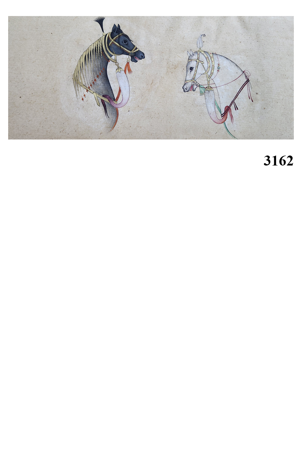This exquisite miniature painting captures a serene moment between two horses, each adorned with intricate bridles and decorative elements. The painting features: